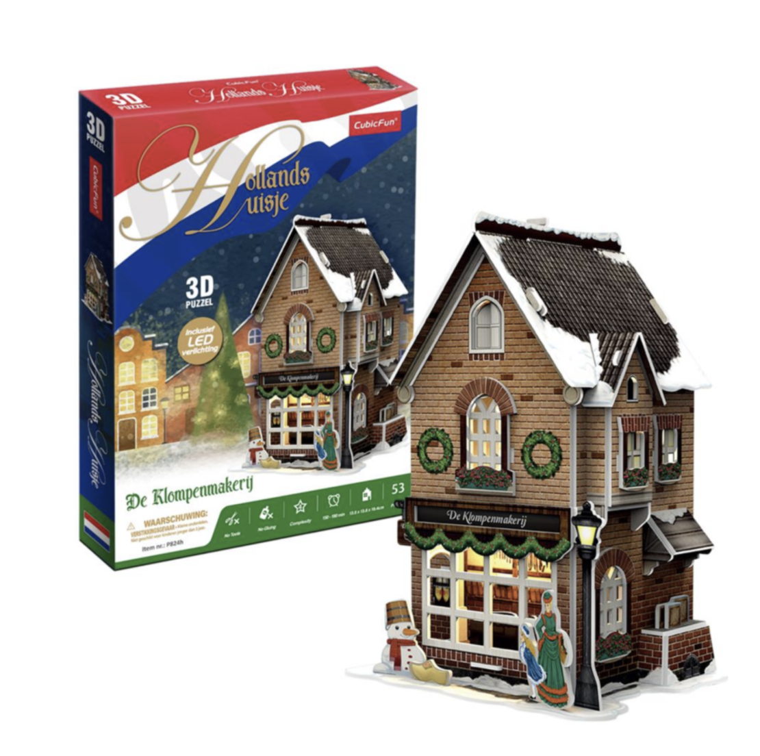 Maak je eigen kerstdorp met deze 3-D Klompenmakerij puzzel, inclusief Ledverlichting. Geen gereedschap of lijm nodig. Bestaande uit 60 stukjes. Formaat: ca. 13,5 x 19,4 x 13,8 cm. Verpakt in een full color doos. Geschikt voor kinderen vanaf 8 jaar