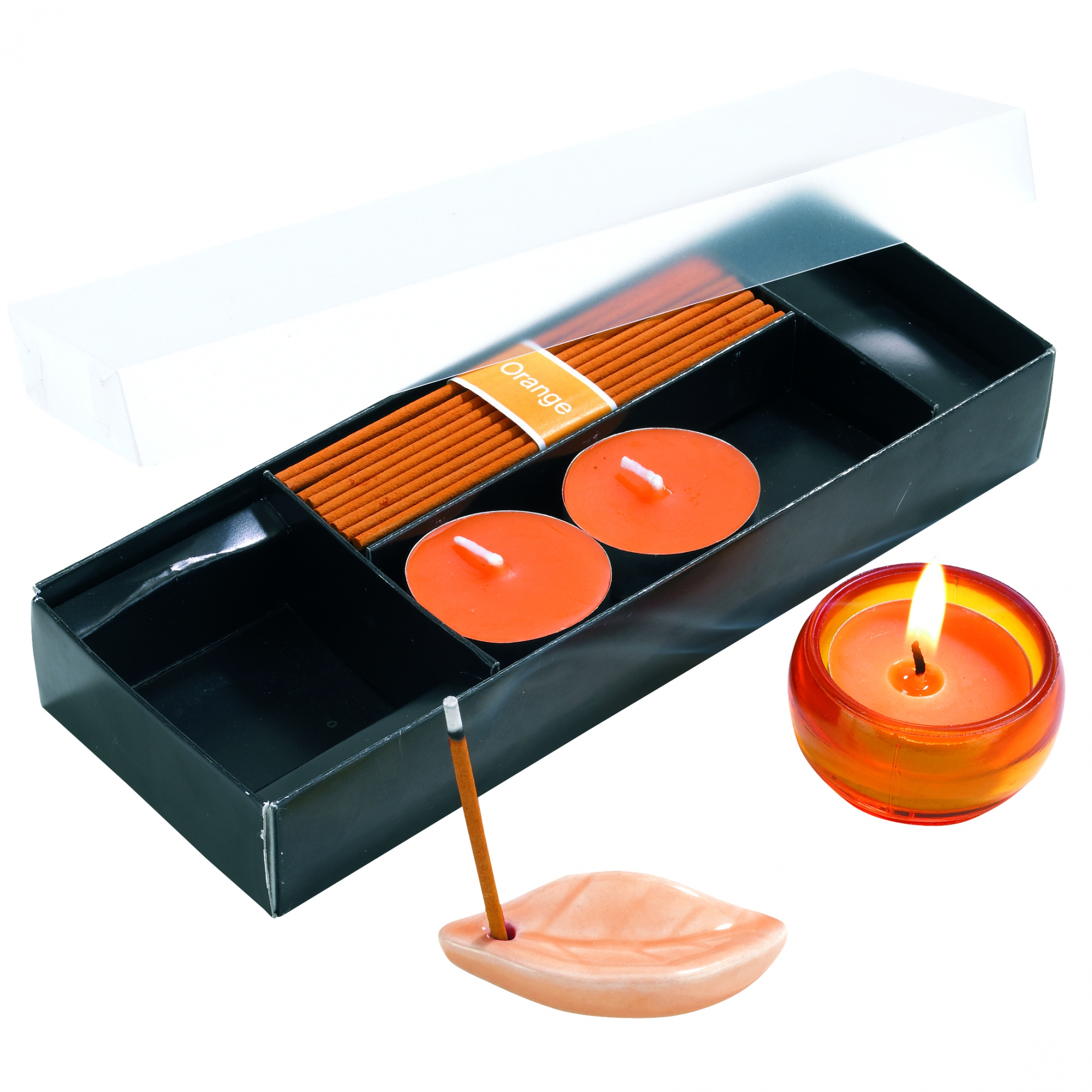 5-delige kaarsenset ATMOSPHERE bestaande uit 3 waxinelichtjes, een glazen houder, 10 geurstaafjes met houder van keramiek.