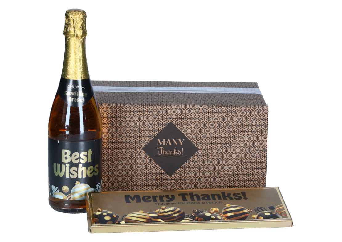 De grote melkchocoladereep XXL met de tekst “Merry Thanks” is een heerlijke traktatie die dankbaarheid letterlijk laat proeven. Samen met de feestelijke sparkling grape 0.0% – voorzien van de boodschap “Best Wishes” – vormt het een perfecte combinatie om het jaar op een positieve en bruisende manier af te sluiten.