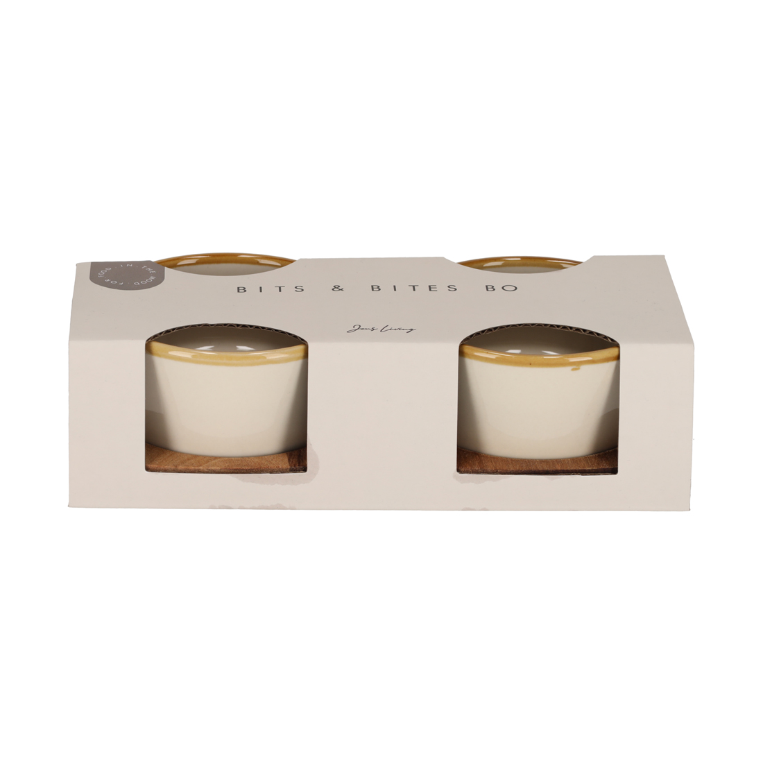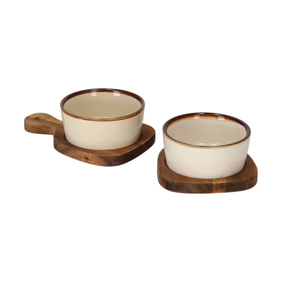 De Bits & Bites serveerschaaltjes zijn ideaal bij het serveren van lekkere snacks en dips. Deze duo set bestaat uit twee acaciahouten plankjes met een handig handvat en twee keramieken schaaltjes. Door de inkepingen in het plankje blijven de schaaltjes goed op hun plek en kunnen deze niet verschuiven tijdens het optillen van het plankje. Het houten dienblad is niet vaatwasser bestendig. Neem de plankjes af met een vochtige doek voor langdurig gebruik en behoud van kwaliteit.