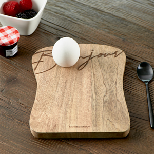 De Bonjour Bread Plate is een broodplank met een uitsparing voor een eitje. De plank van mangohout heeft de vorm van een snee brood en bovenaan is de tekst ‘Bonjour’ in het hout gebrand.