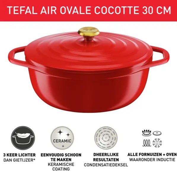 Traditionele gietijzeren cocottes zijn een nachtmerrie om op te tillen, of het nu is om te koken, te serveren of schoon te maken. Precies daarom heeft Tefal de Air Cocotte ontworpen! Deze pot is ambachtelijk vervaardigd uit robuust gegoten aluminium, waardoor hij wel 3 keer lichter is dan traditionele gietijzeren potten. Hij is perfect voor dagelijks gebruik en kan zo van het keukenaanrecht op tafel gezet worden. Ontdek deze cocotte stoofpot met vaatwasserbestendig ontwerp dat gemakkelijk schoon te maken is. Bovendien is deze pot geschikt voor gebruik op de kookplaat en in de oven. Het condensvormende deksel staat garant voor malse kookresultaten op een eindeloze reeks recepten!