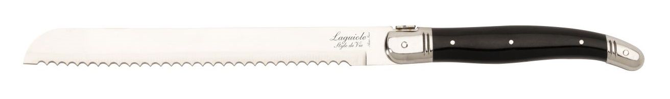 Met het broodmes zwart met stokbroodplank uit de Premium Line van Laguiole Style de Vie haal je een broodmes én handige plank om het brood direct op te snijden in huis. De plank vangt de kruimels op en heeft een insnede waardoor je eenvoudig door het brood heen snijdt. Het mes is vlijmscherp, heeft een lemmetdikte van 1,5 mm en is vaatwasmachinebestendig. De plank mag niet in de vaatwasser.