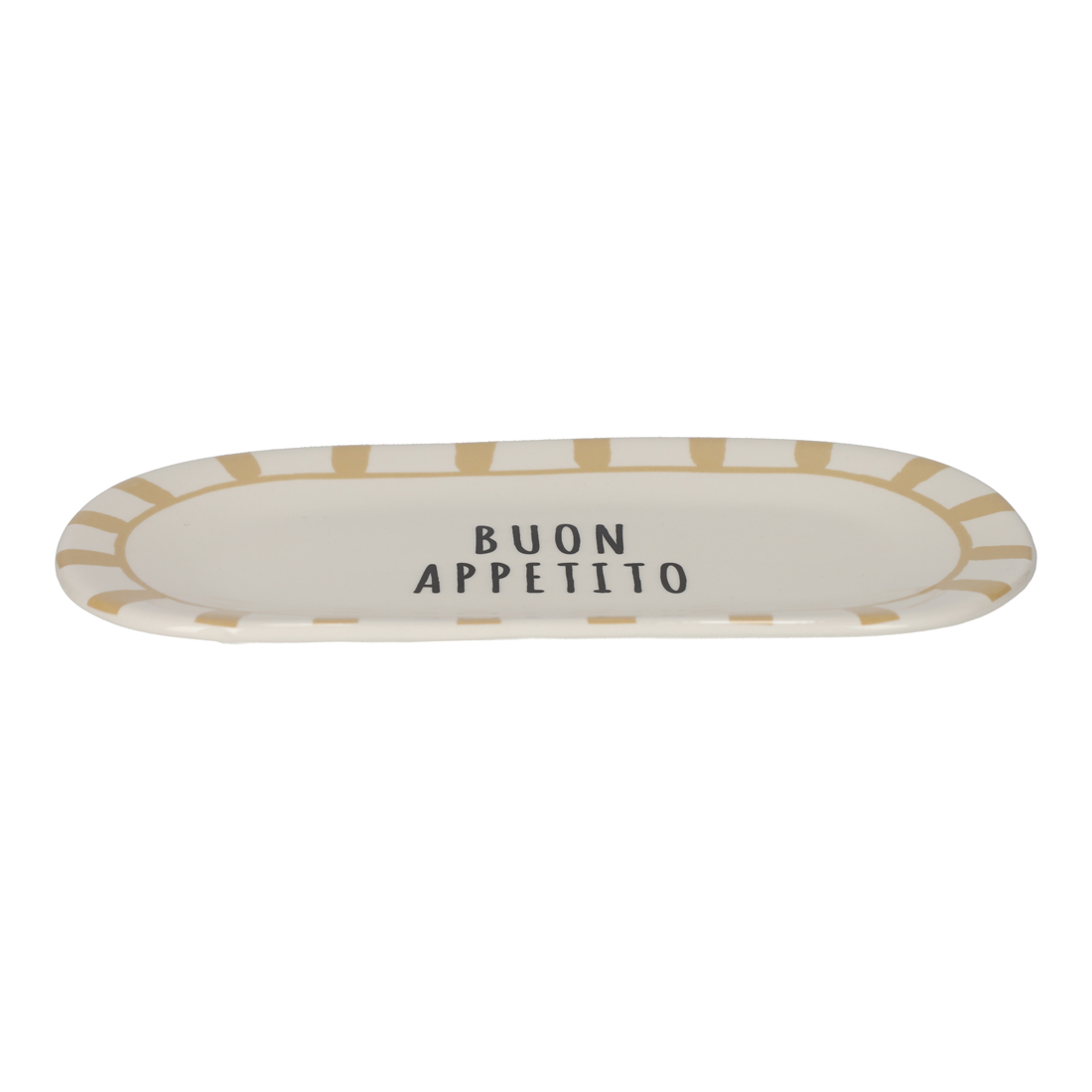 Met dit serveerbord met de tekst 'Buon Appetito' haal je de Italiaanse gezelligheid in huis. Het bord van hoogwaardig keramiek is perfect voor het presenteren van hapjes, snacks en bijgerechten tijdens het diner. Door het vrolijke design is het bord een feestelijke toevoeging op iedere tafel!