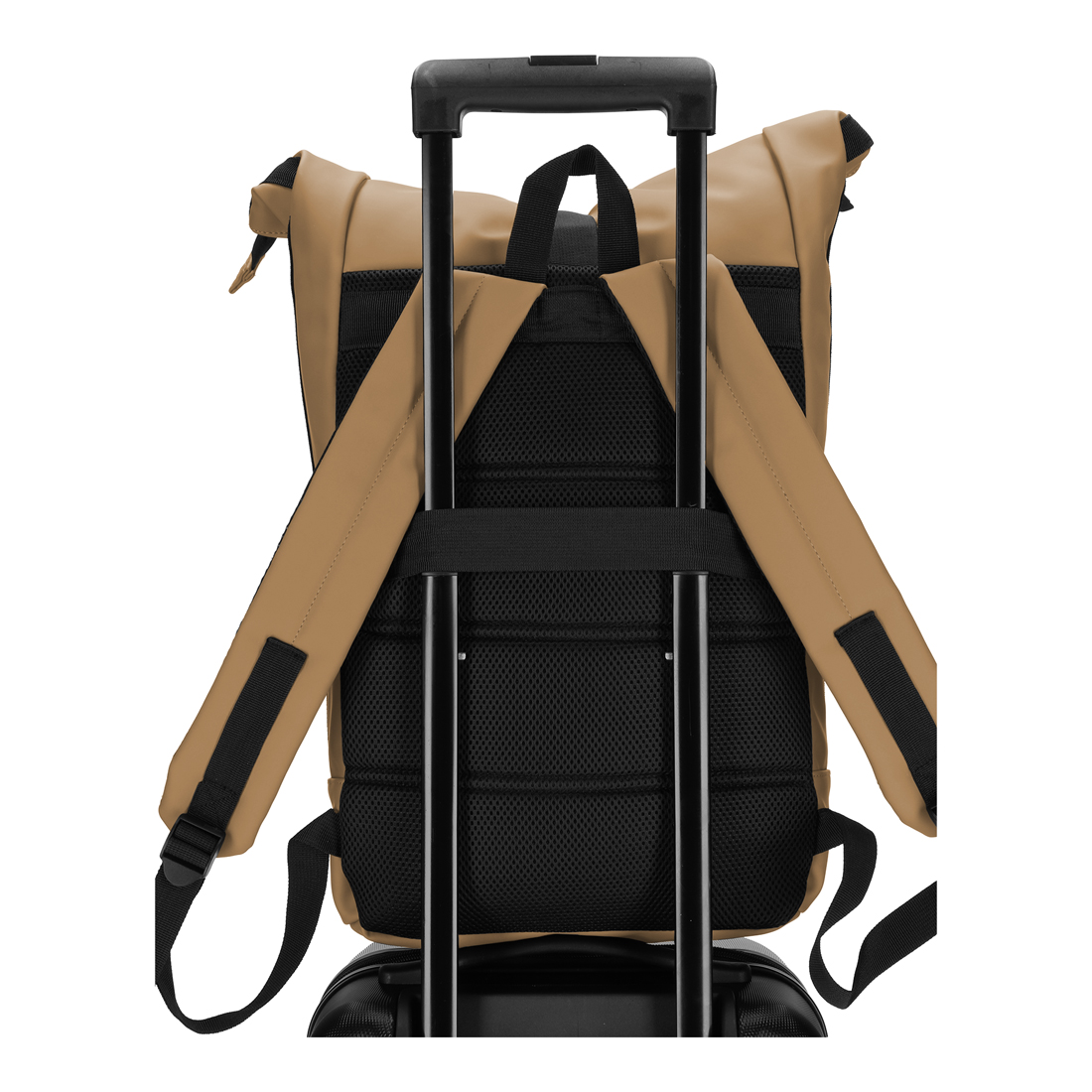 De Dull PU rol rugtas is de perfecte tas om mee te nemen als je op pad gaat. De tas is eenvoudig te herkennen aan het stoere matte vegan leer waarvan de tas gemaakt is. Door de gecoate ritssluitingen en het waterafstotende materiaal is de tas geschikt voor ieder weertype. De bovenzijde van de tas is op te rollen en middels een gesp af te sluiten. Aan de voorzijde van de tas zit een afsluitbaar opbergvak en met de verstelbare schouderbanden pas je de tas eenvoudig aan naar het gewenste draagcomfort. De rugzijde is voorzien van een foam voering. Daarnaast zit hier ook een zogenaamde trolleyband, waarmee je de tas bijvoorbeeld over een trolleystang zou kunnen schuiven. Tot slot beschikt de tas over een laptop divider aan de binnenzijde en een extra afsluitbaar binnenvakje voor kleine accessoires.