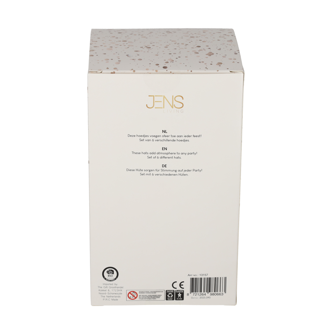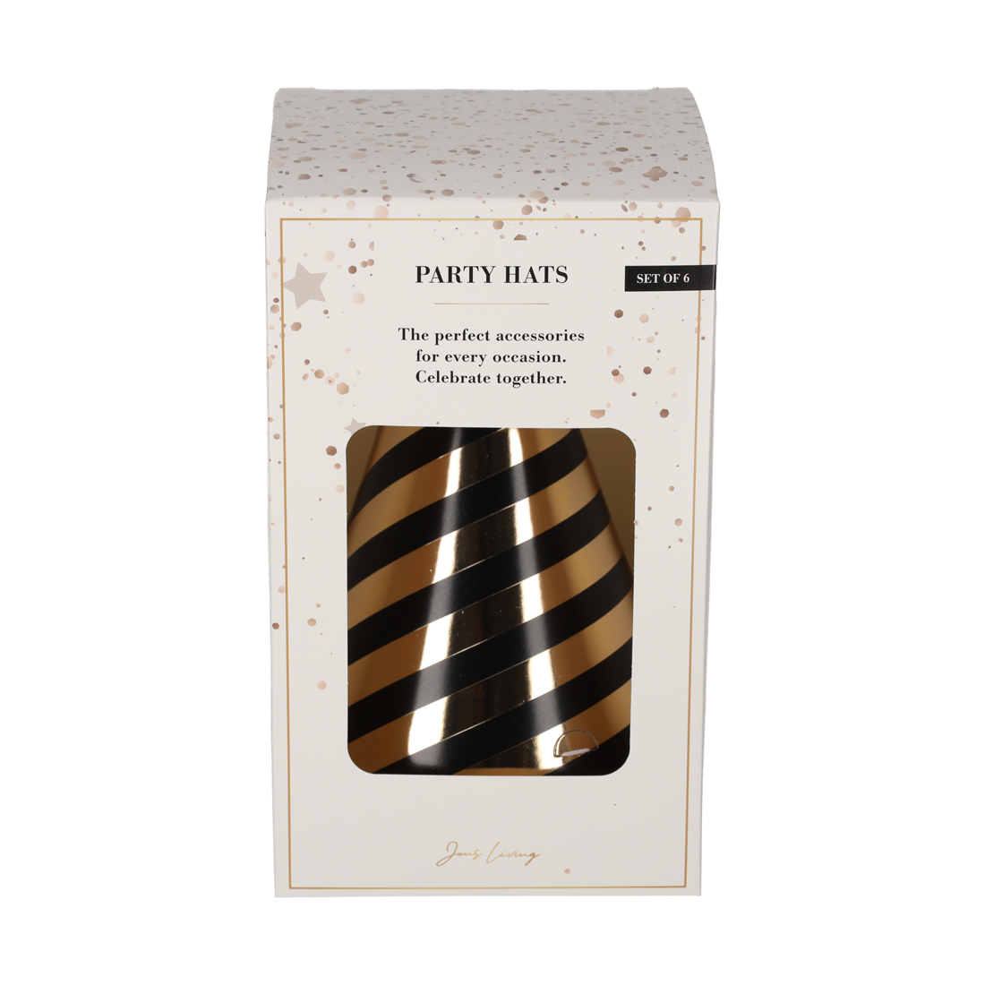 Maak er een feestje van met deze set van zes feesthoedjes! Perfect voor verjaardagen of elke andere feestelijke gelegenheid. De set bestaat uit drie feestelijke prints in de kleuren goud, wit en zwart.