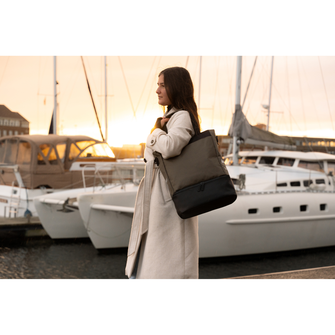 Deze ruime all-in-one shopper is gemaakt van gerecycled polyester, wat deze tas een duurzaam karakter geeft. In deze tas zijn maar liefst 10 PET flessen verwerkt. Het ritsvak van vegan leer geeft de tas een stoere touch. Deze tas is uitgerust met een groot hoofdvak en een ritscompartiment onderin dat door het isolatiemateriaal geschikt is om eten en drinken koel te houden. Daarnaast is de tas uitgerust met reflecterende strepen voor extra zichtbaarheid in het donker. De shopper is makkelijk mee te nemen aan de handvatten of schouderband en kan bevestigd worden aan een fietsendrager door middel van de fietshaken aan de achterzijde.