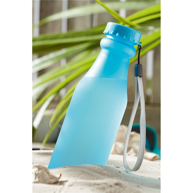 Frosted kunststof drinkfles TAKE AND GO met schroefdop in vorm van een kroonkurk en een handige polsband. Inhoud ca. 500ml.