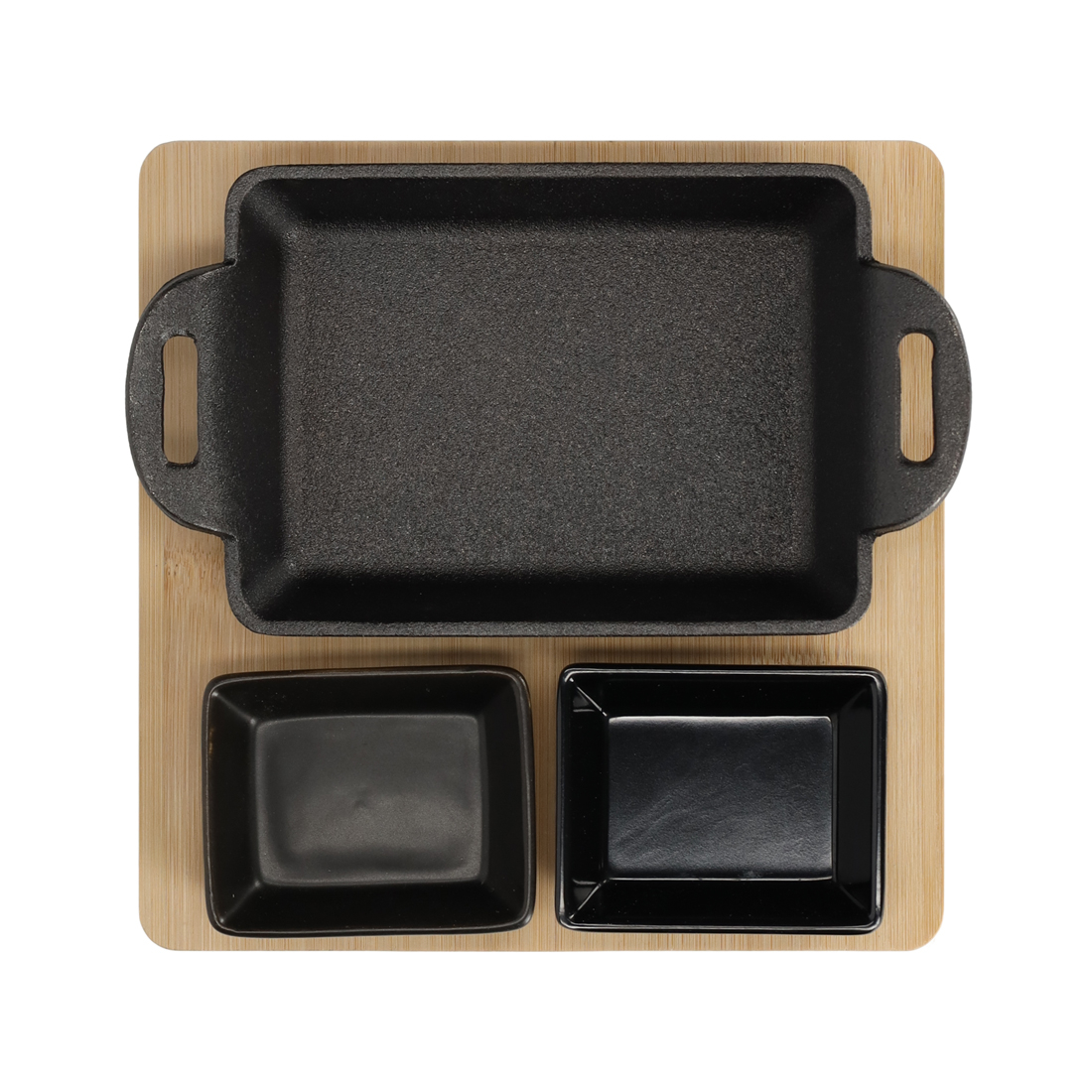 Presenteer je gerechten of hapjes op een bijzondere manier met deze stijlvolle serveerset. De set bestaat uit een bamboe houten plank, twee keramische bakjes en een gietijzeren schaal. Perfect voor het serveren van bijvoorbeeld nacho's met guacamole en salsa dip. Deze set voegt een sfeervolle en functionele touch toe aan je tafel, ideaal voor zowel informele borrels als gezellige etentjes.