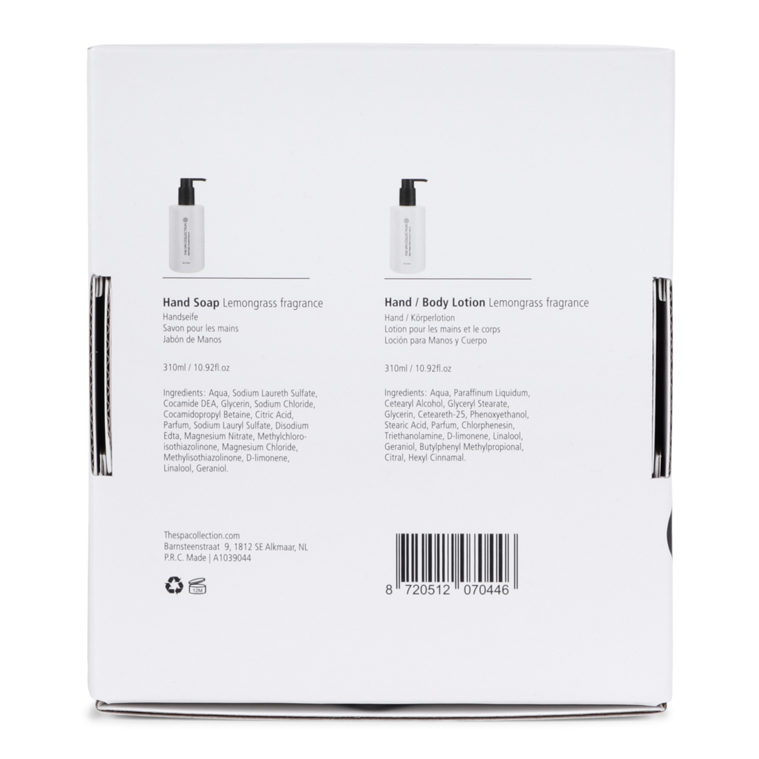 Een cadeaupakket bestaande uit de bekende pompflacons van de THE SPA COLLECTION. De set bestaat uit twee pompflacons van 310 ml met daarin handzeep en body lotion. Deze lijn ruikt naar de heerlijk verfrissende geur van citroengras. Dit cadeaupakket is ideaal om te geven en fantastisch om te krijgen.