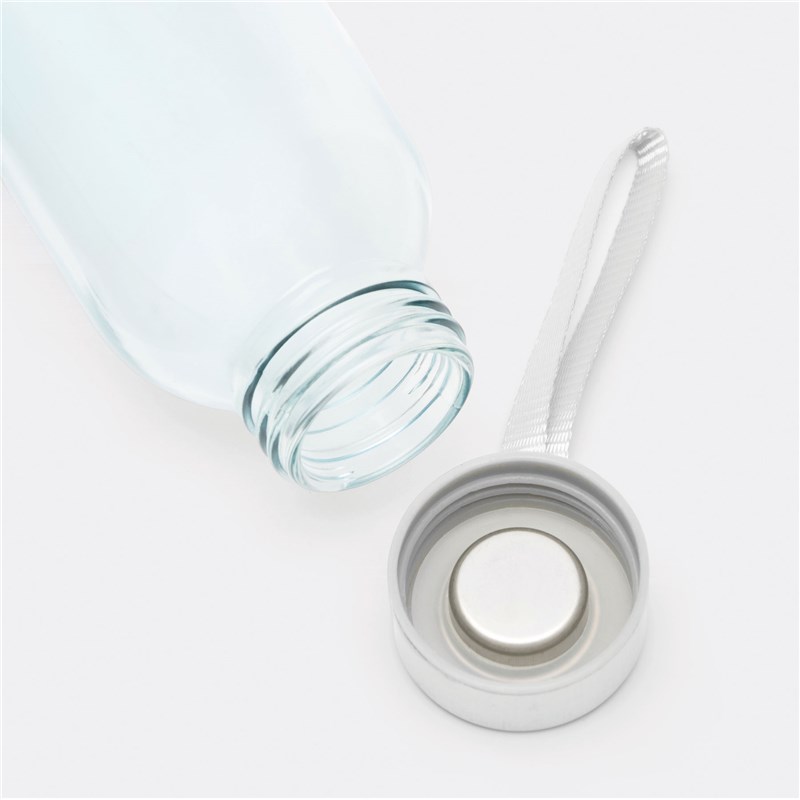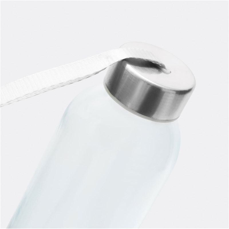 Glazen drinkfles TAKE SMART: met RVS schroefdop en siliconen afsluitring. Met draaglus, inhoud ca. 500 ml, verpakt in een witte doos.