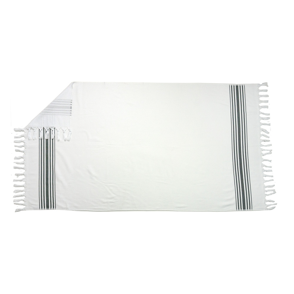 Prachtige kwaliteit witte Hamamdoek met aan de boven- en onderkant grijze strepen. Gemaakt van 100% katoen. De binnenkant is badstof waardoor de doek heel goed vocht opneemt. De afmeting is 70*180 cm en geschikt voor de wasmachine.