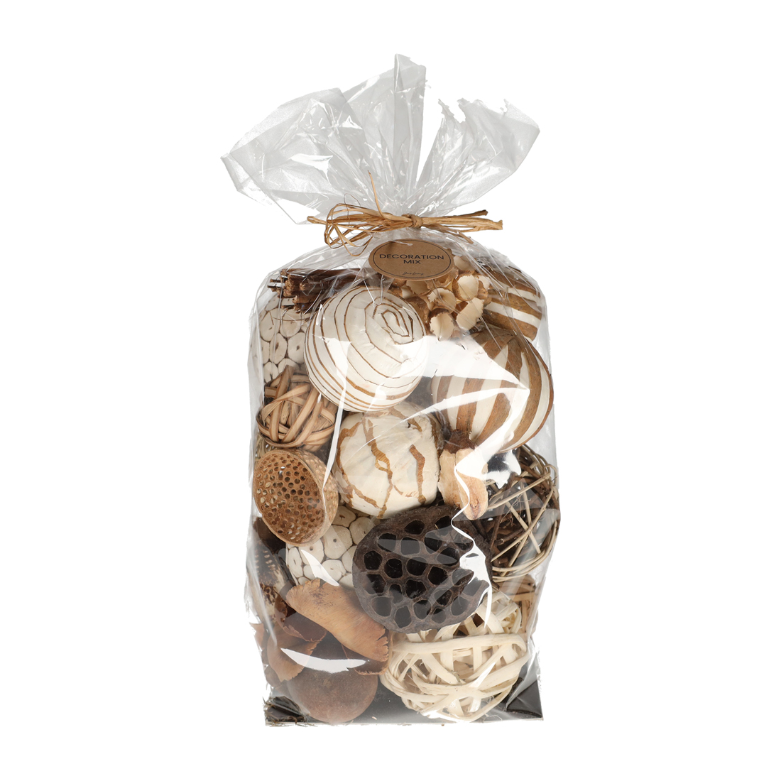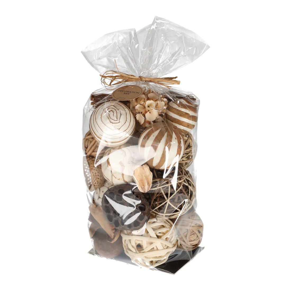 De decoratie mix bestaat uit handgemaakte items vervaardigd uit delen van gedroogde planten en bloemen. Hierdoor is ieder item uniek. Gebruik de mix bijvoorbeeld voor een mooi herfstplateau met kaarsen of in een kerststuk.