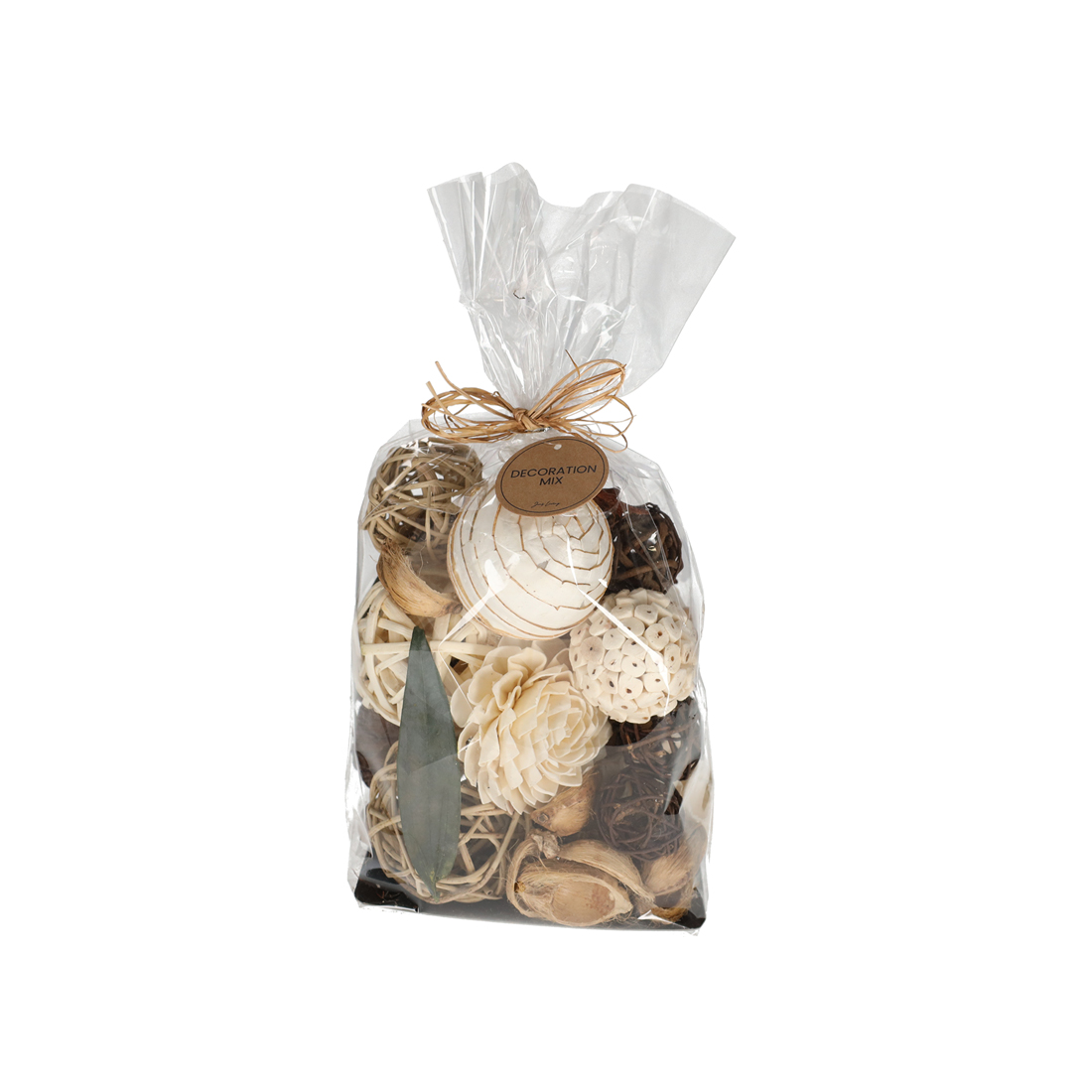 De decoratie mix bestaat uit handgemaakte items vervaardigd uit delen van gedroogde planten en bloemen. Hierdoor is ieder item uniek. Gebruik de mix bijvoorbeeld voor een mooi herfstplateau met kaarsen of in een kerststuk.