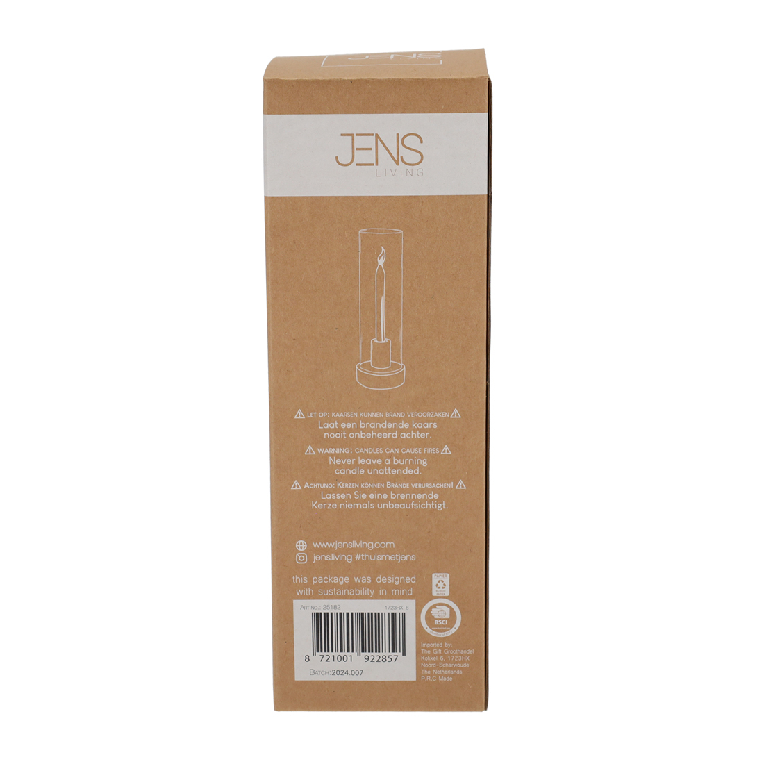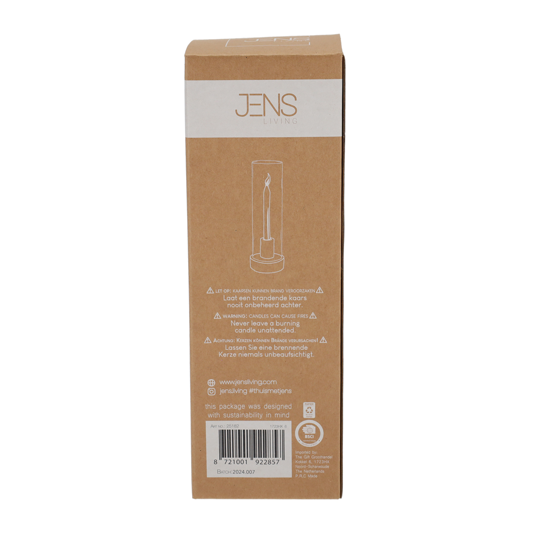 Deze betonnen kandelaar past in ieder interieurstijl. Door de glazen cilinder krijgt de kandelaar niet alleen een unieke uitstraling, maar is deze ook als windlicht te gebruiken. De kandelaar is geschikt voor dinerkaarsen en mocht de kaars druipen, dan valt het kaarsvet in de verzonken rand. Deze kandelaar kan ook gebruikt worden als vaasje voor droogbloemen.