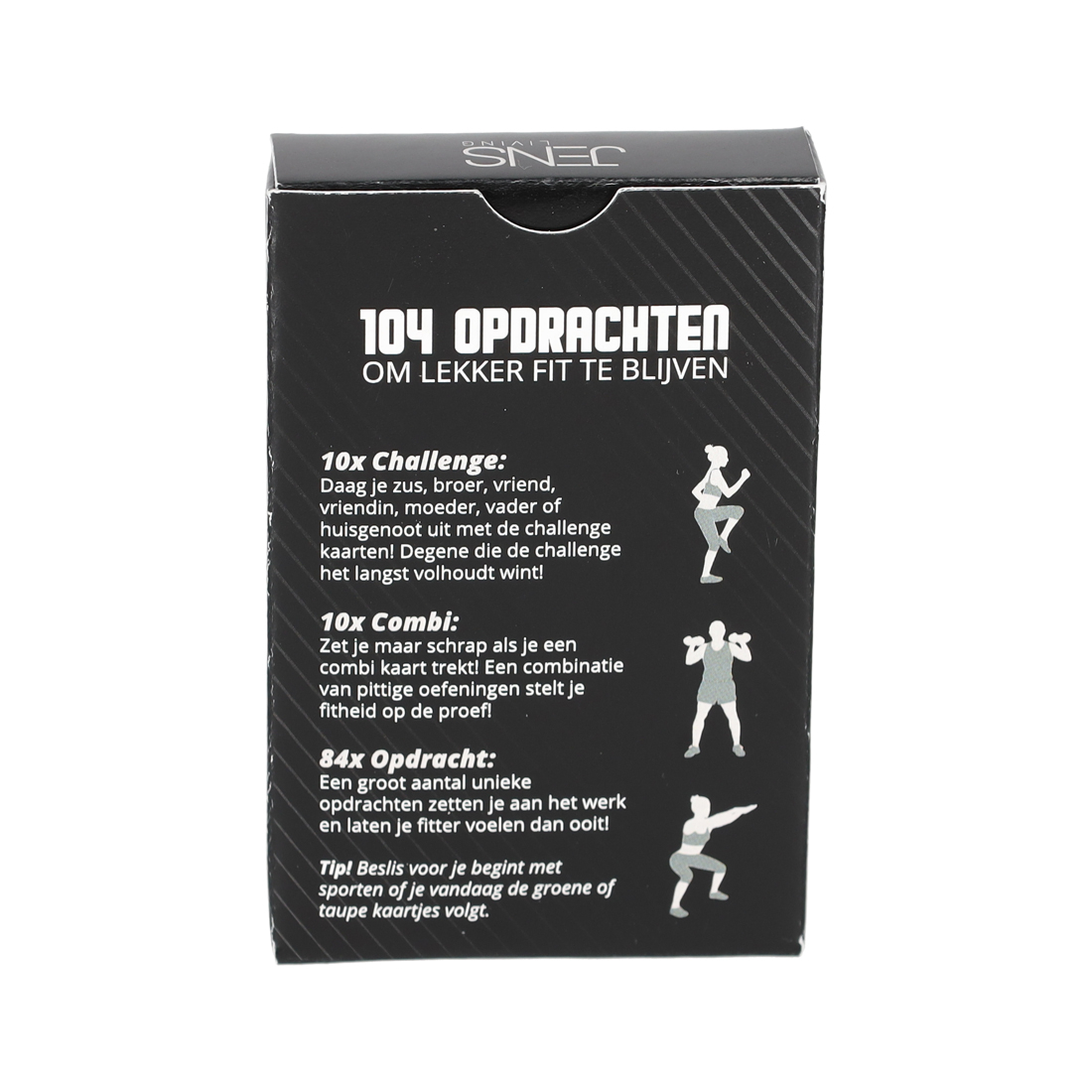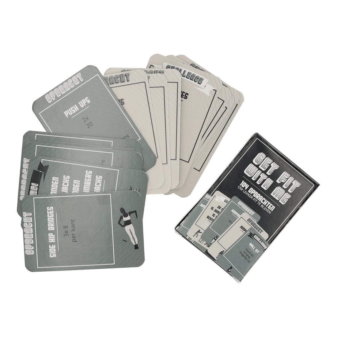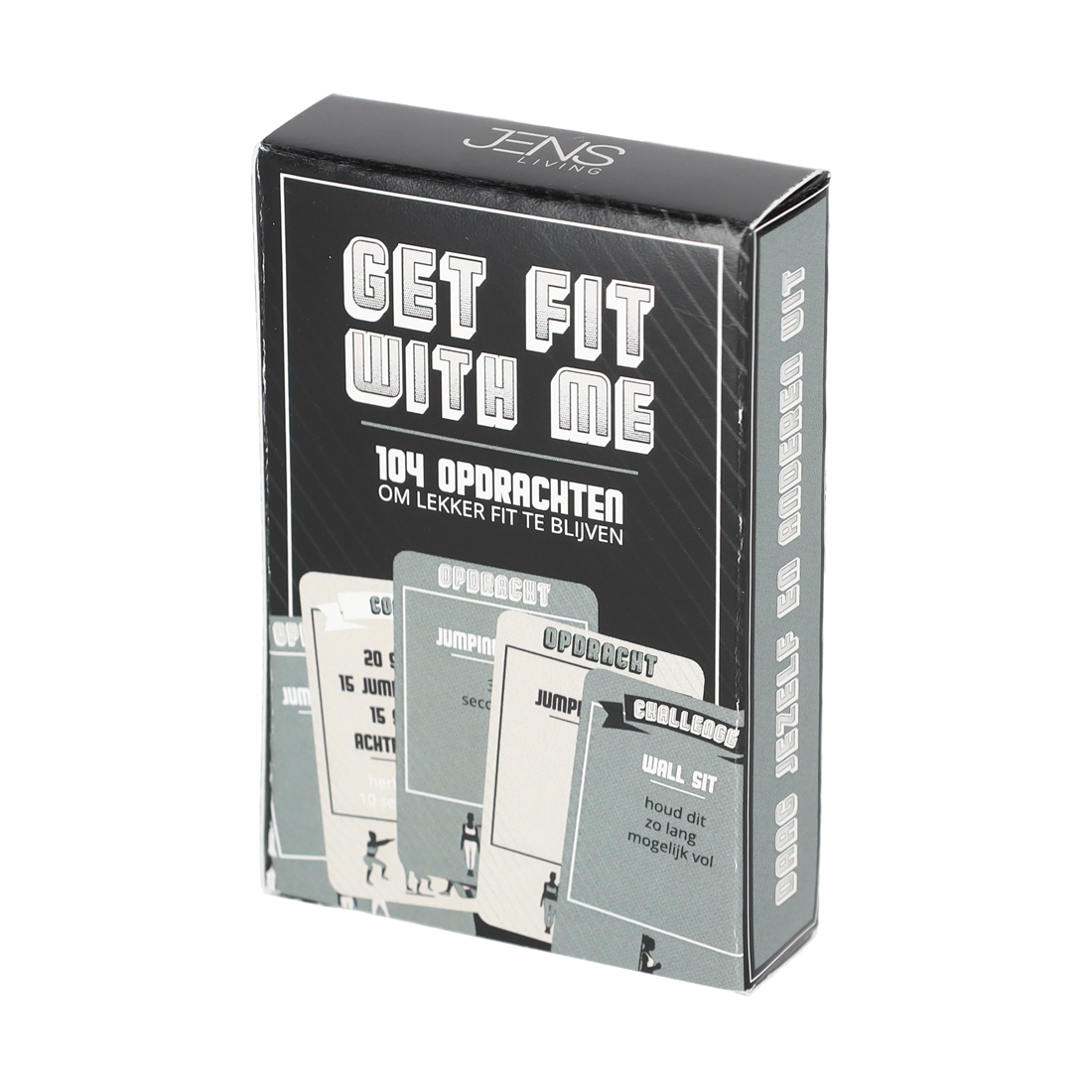 Vind jij het ook zo belangrijk om thuis fit te blijven? Dan is het nieuwe Get Fit With Me Kaartspel echt iets voor jou! Het spel bestaat uit een set van 50 kaarten met daarop 100 sportieve opdrachten om fit te blijven. Zorg iedere dag voor een gevarieerde work-out door enkele kaarten te trekken uit het Get Fit With Me Kaartspel en de beschreven oefeningen uit te voeren.