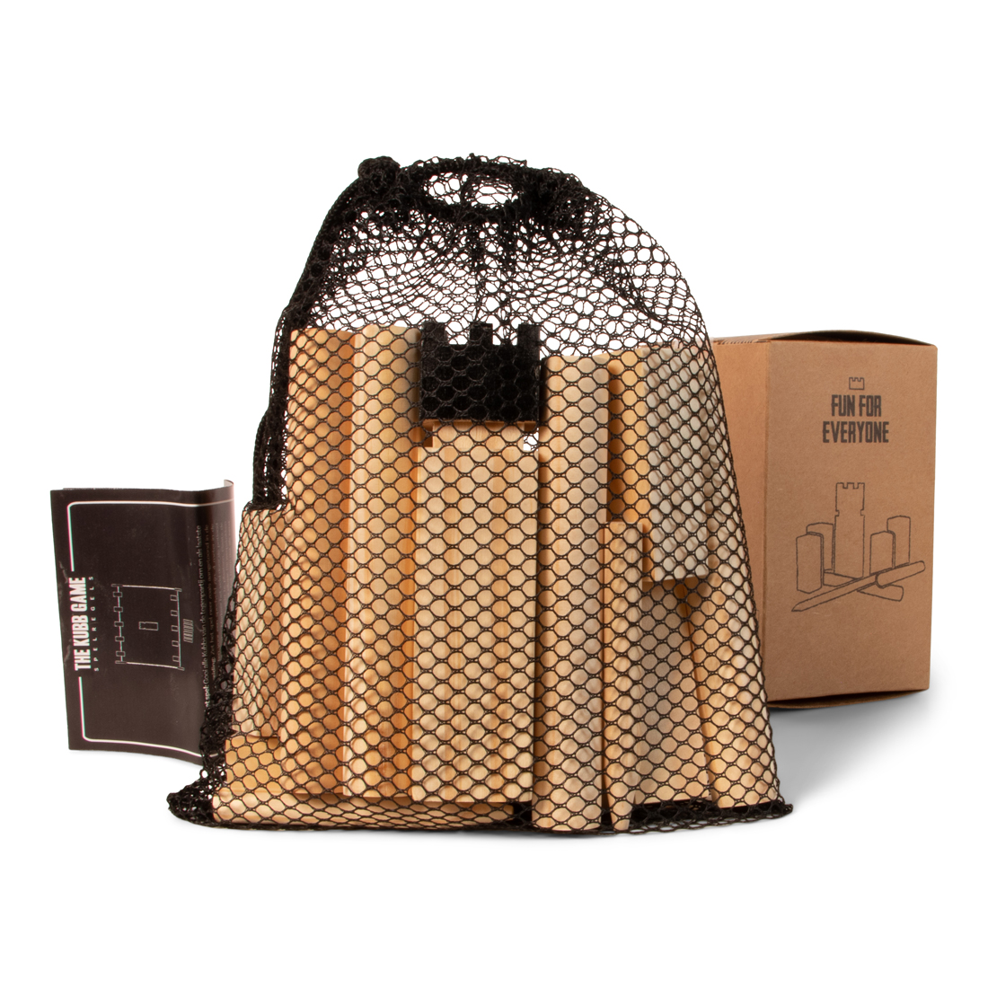 Kubb is van origine een Zweeds werpspel dat voornamelijk buiten wordt gespeeld. Tegenwoordig is dit spel wereldwijd populair. Het is een ontzettend leuke activiteit voor bijvoorbeeld in de tuin, speeltuin of in het park. Het spel speel je met twee teams van maximaal 6 spelers per team. Het doel is om alle kubbs van het andere team om te gooien. Hierna mag je op de koning mikken in het midden van het speelgebied. Gooi je de koning ook om, dan heeft jouw team gewonnen. Het spel bestaat uit: 1 koning, 6 werpstokken, 10 ridders en 4 hoekstokken.