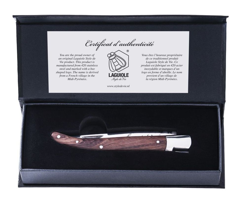 Het rozenhouten zakmes uit de Luxury Line van Laguiole Style de Vie biedt stijl en scherpte in één. Het gladde lemmet van het zakmes is gemaakt van rvs en is afgewerkt met het authentieke Laguiole bijtje. Het lemmet heeft een dikte van 2,5 mm en is niet vaatwasmachinebestendig. Elk zakmes wordt verpakt in een luxe geschenkverpakking.