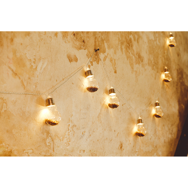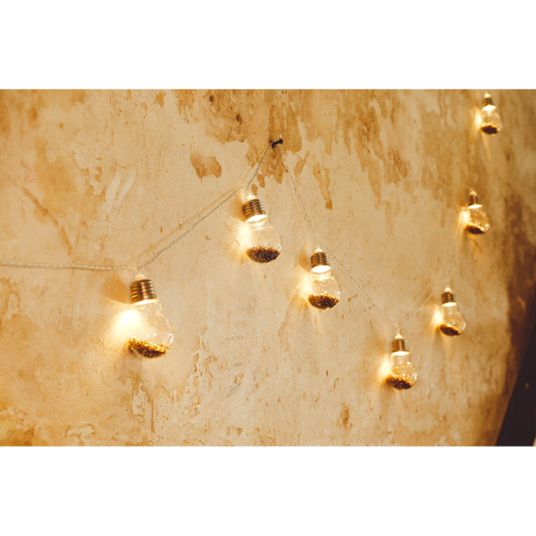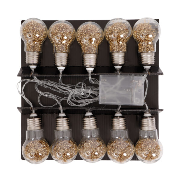 Breng licht en glitter tijdens de donkere dagen! Decoreer de kerstboom, kast of iets anders in huis met deze mooie lichtslinger. De slinger bevat 10 bollen met LED lampjes en is gevuld met glitters. De totale lengte van de slinger is 3,6 meter.