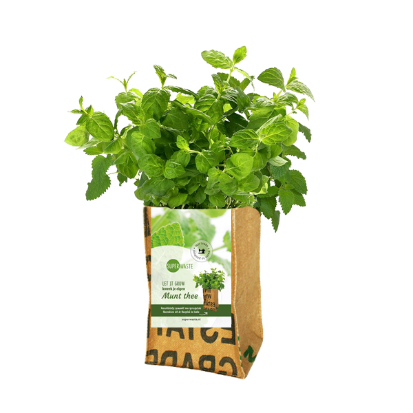 Het kweektuintje is gemaakt van gerecyclede theezakken uit de theepluk in India.