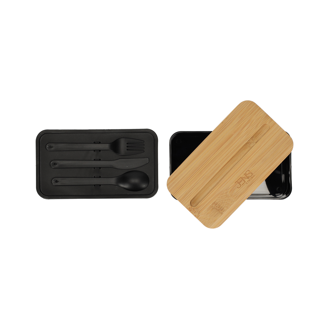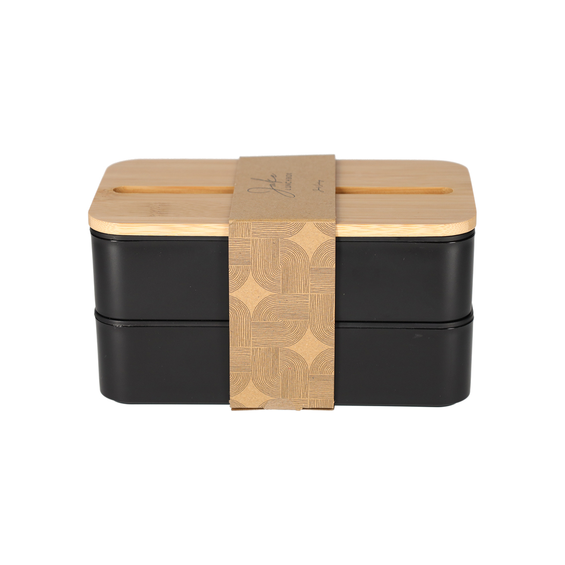 Deze handige lunchbox is zowel stijlvol als functioneel. De lunchbox heeft twee lagen. De onderste laag is verdeeld in twee vakken. De bovenste is één groot compartiment. Daarnaast kan de deksel van duurzaam bamboe hout gebruikt worden als telefoonstandaard. De lunchbox bevat een bestekset met een mes, vork en lepel. Sluit de broodtrommel met de bijgeleverde elastieken band. Dit artikel is niet vaatwasser bestendig. Was het product met de hand af voor een langdurig gebruik en behoud van kwaliteit.
