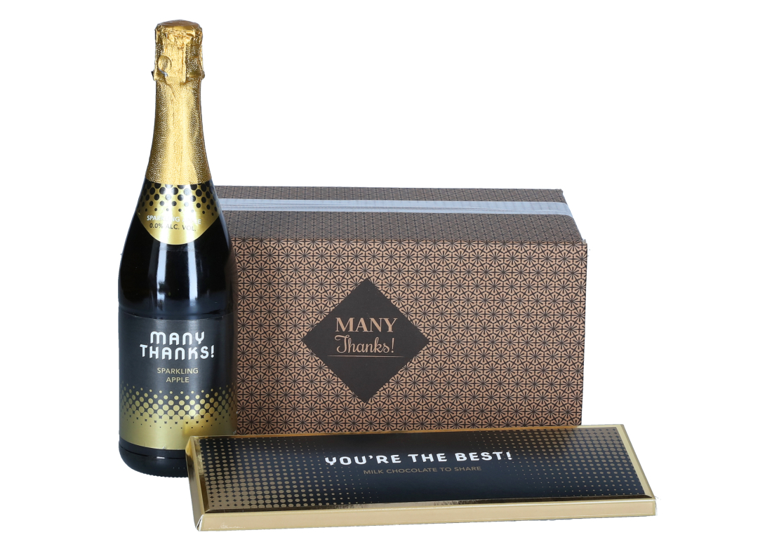 De grote melkchocoladereep XXL met de tekst “You're the Best” spreekt boekdelen: een heerlijke manier om iemand te laten weten hoe bijzonder hij of zij is. Combineer dat met de verfrissende sparkling grape 0.0% met de tekst “Many Thanks”, en je hebt een perfecte toast op samenwerking, inzet of gewoon op elkaar.