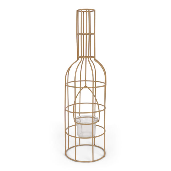 Deze originele waxinelichthouder heeft de vorm van een wijnfles en misstaat in geen enkele woning. Steek een waxinelichtje aan en stop deze in de glazen houder. Hang deze vervolgens op aan het metalen frame en geniet van het warme licht.