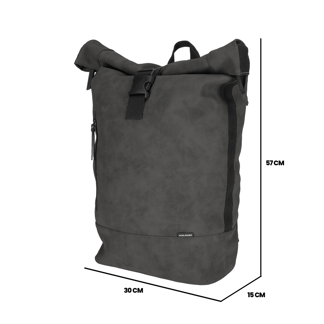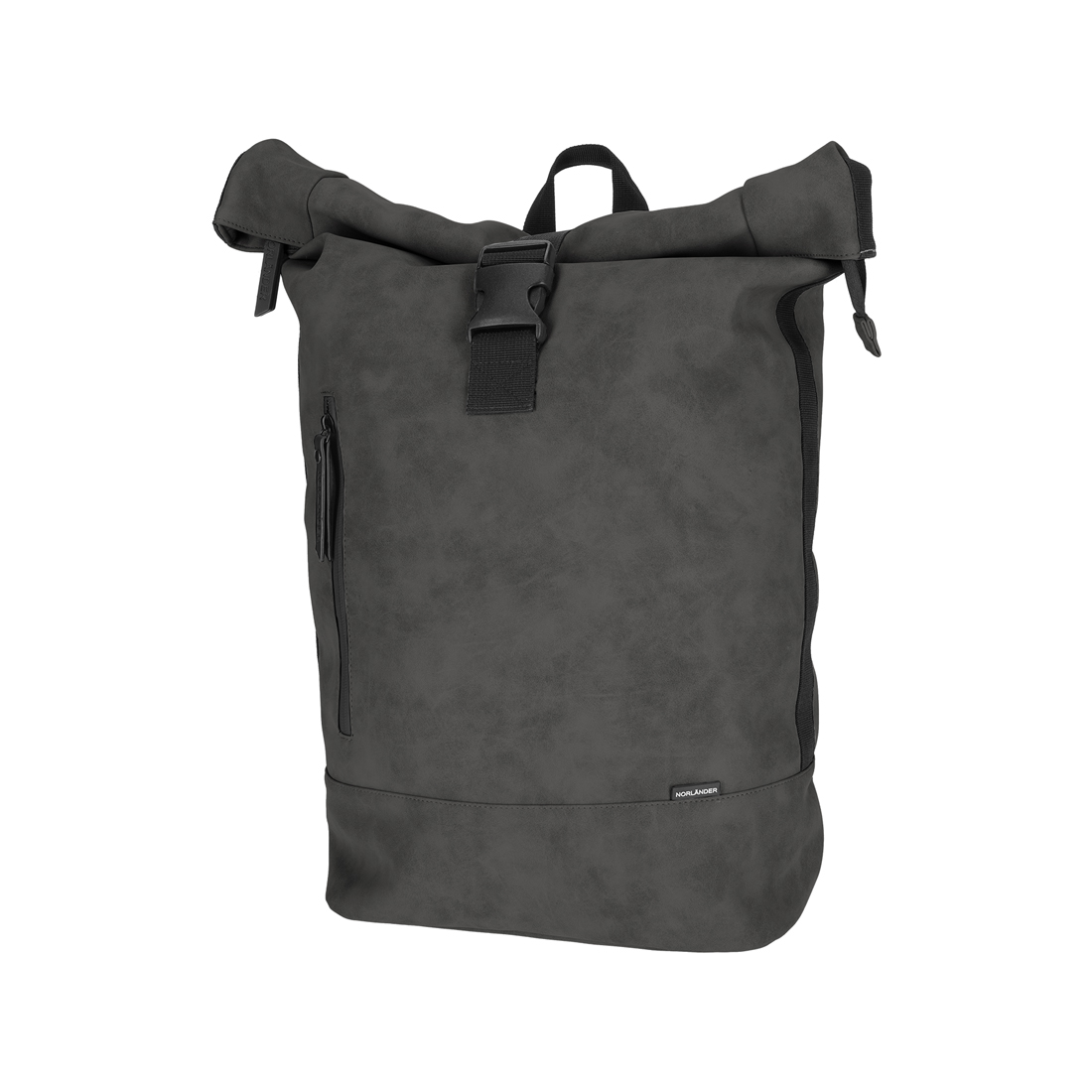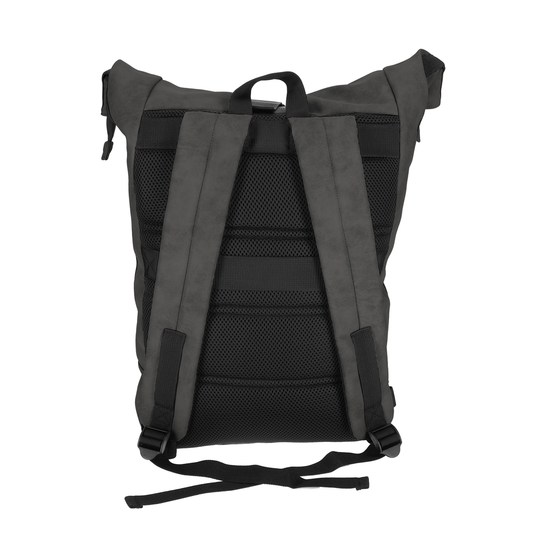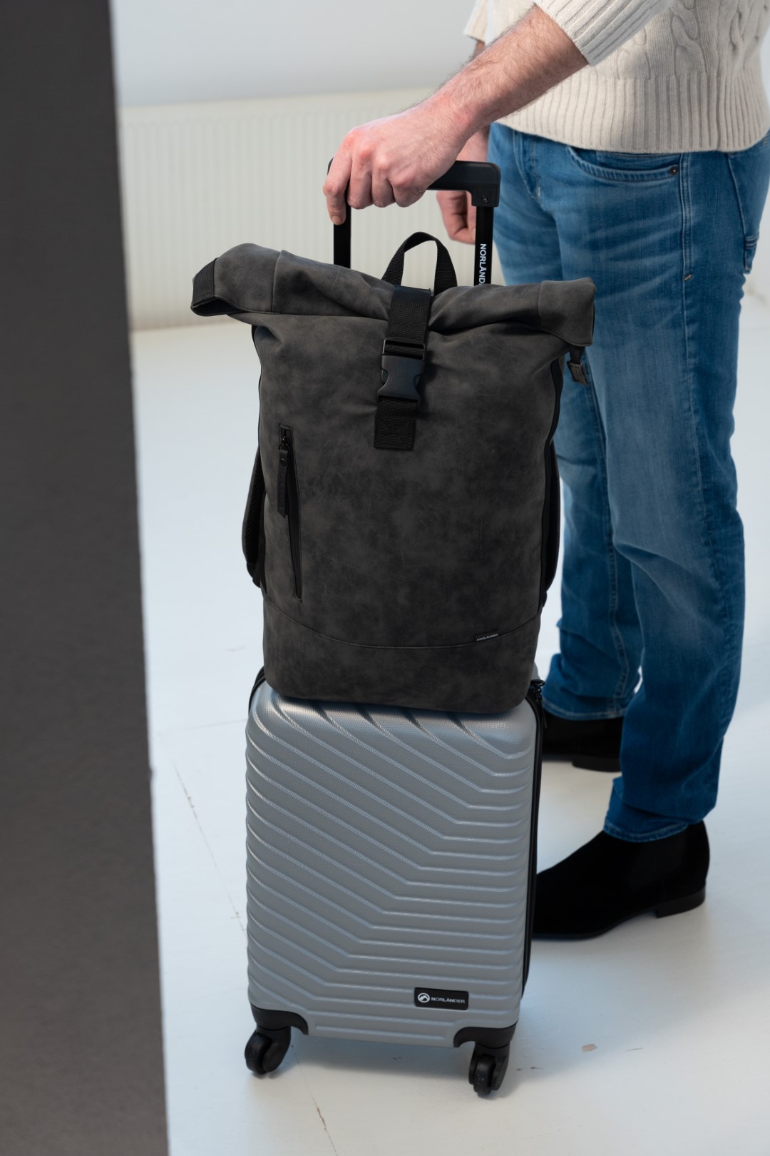 De Nubuck rol rugtas is de perfecte tas om mee te nemen als je op pad gaat. De tas is eenvoudig te herkennen aan het stoere vegan leer waarvan de tas gemaakt is. Door de gecoate ritssluitingen en het waterafstotende materiaal is de tas geschikt voor ieder weertype. De bovenzijde van de tas is op te rollen en middels een gesp af te sluiten. Aan de voorzijde van de tas zit een afsluitbaar opbergvak en met de verstelbare schouderbanden pas je de tas eenvoudig aan naar het gewenste draagcomfort. De rugzijde is voorzien van een foam voering. Daarnaast zit hier ook een zogenaamde trolleyband, waarmee je de tas bijvoorbeeld over een trolleystang zou kunnen schuiven. Tot slot beschikt de tas over een laptop divider aan de binnenzijde en een extra afsluitbaar binnenvakje voor kleine accessoires.