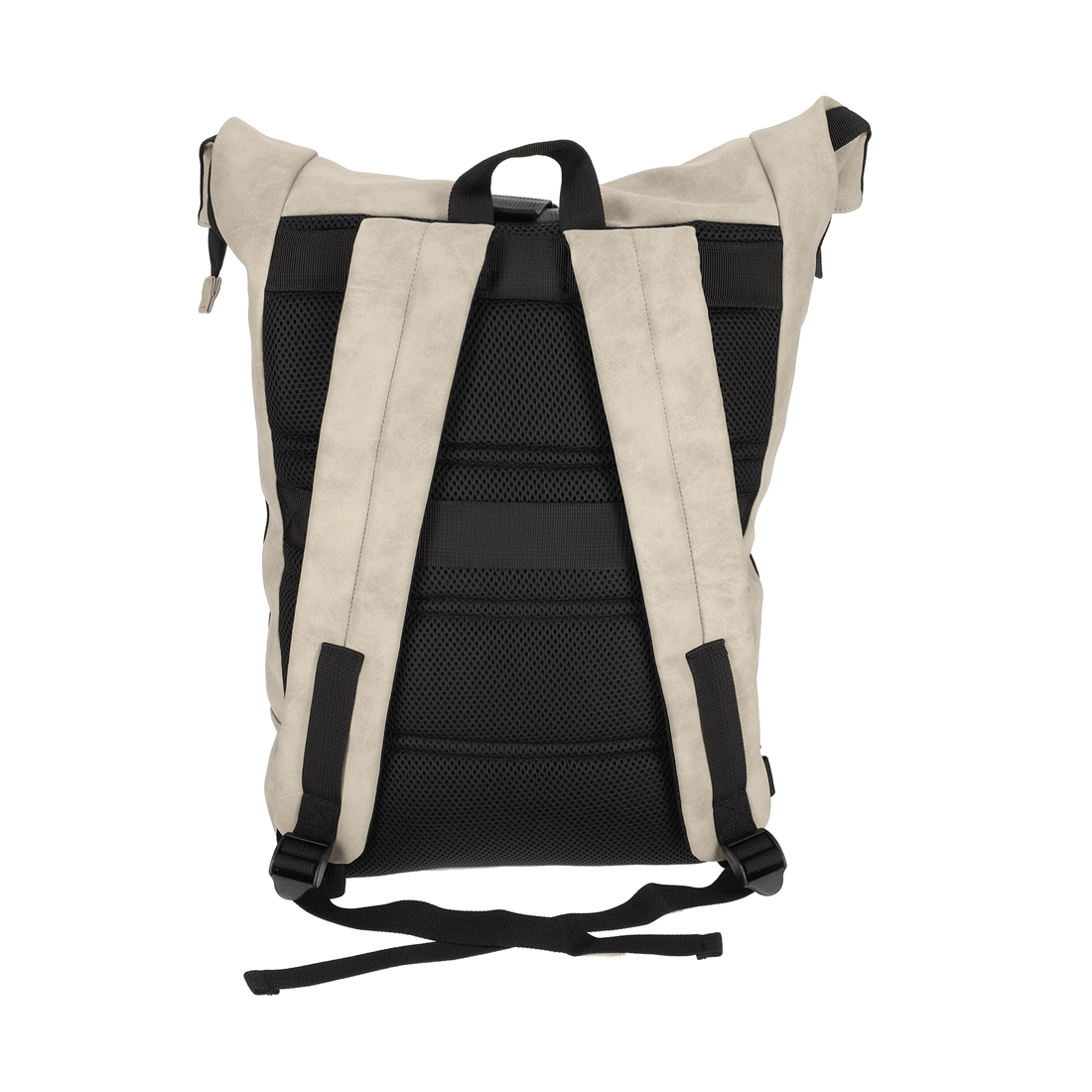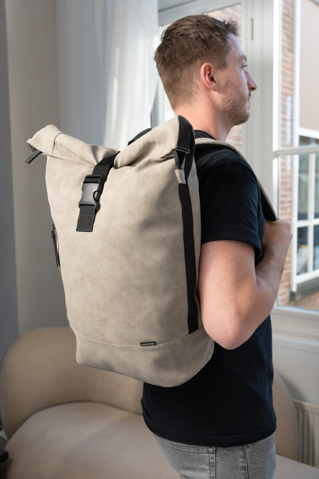 De Nubuck rol rugtas is de perfecte tas om mee te nemen als je op pad gaat. De tas is eenvoudig te herkennen aan het stoere vegan leer waarvan de tas gemaakt is. Door de gecoate ritssluitingen en het waterafstotende materiaal is de tas geschikt voor ieder weertype. De bovenzijde van de tas is op te rollen en middels een gesp af te sluiten. Aan de voorzijde van de tas zit een afsluitbaar opbergvak en met de verstelbare schouderbanden pas je de tas eenvoudig aan naar het gewenste draagcomfort. De rugzijde is voorzien van een foam voering. Daarnaast zit hier ook een zogenaamde trolleyband, waarmee je de tas bijvoorbeeld over een trolleystang zou kunnen schuiven. Tot slot beschikt de tas over een laptop divider aan de binnenzijde en een extra afsluitbaar binnenvakje voor kleine accessoires.