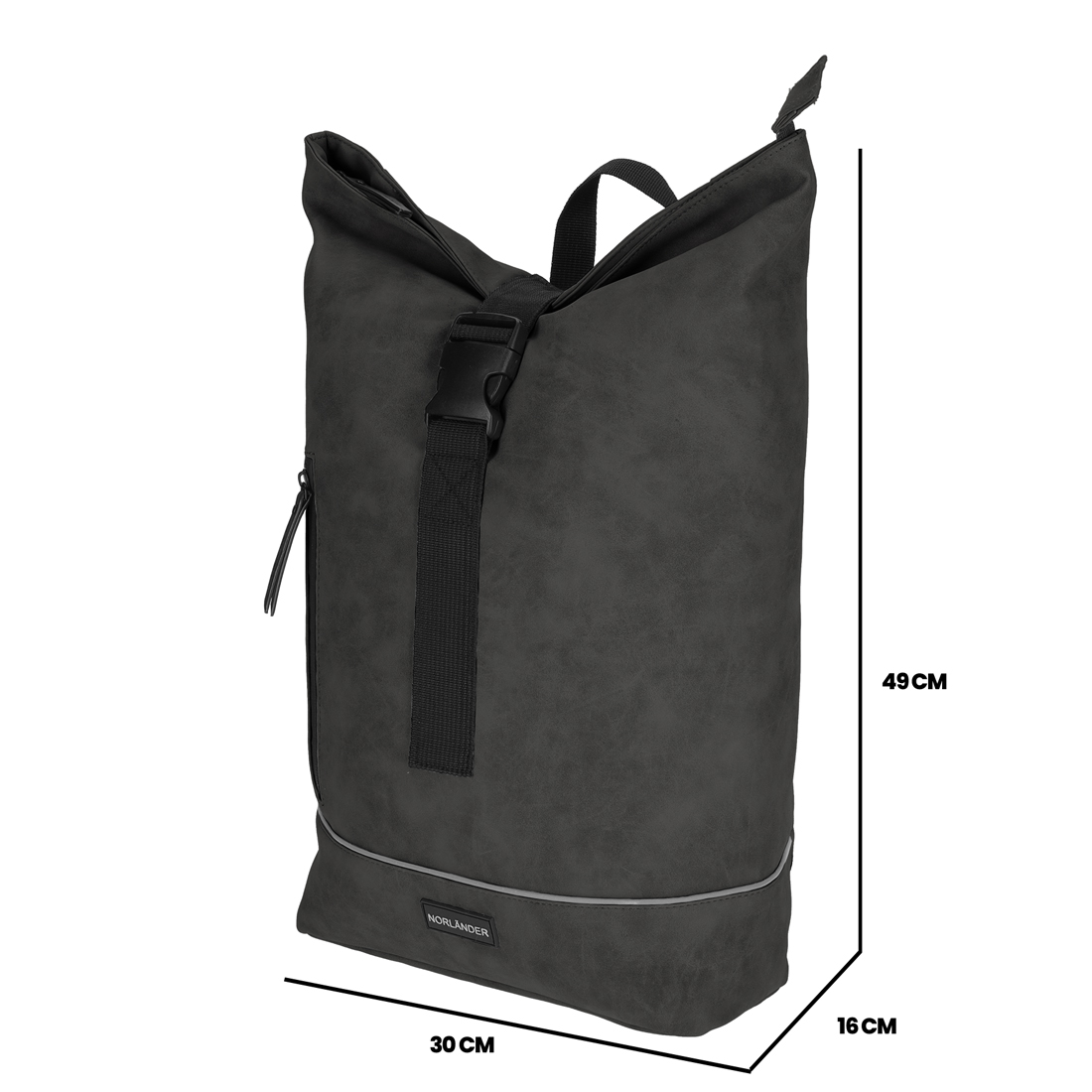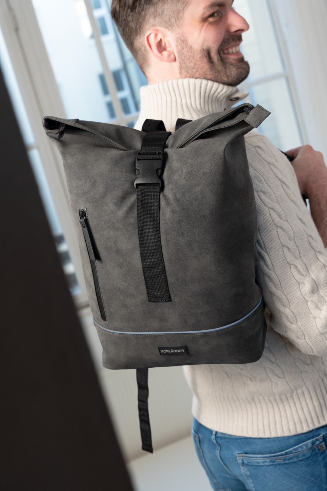 Deze compacte Nubuck rol rugtas neem je overal mee naartoe. De tas is eenvoudig te herkennen aan het stoere vegan leer waarvan de tas gemaakt is. Door de gecoate ritssluitingen en het waterafstotende materiaal is de tas geschikt voor ieder weertype. De bovenzijde van de tas is op te rollen en middels een gesp af te sluiten. Aan de voorzijde van de tas zit een afsluitbaar opbergvak, een NORLÄNDER badge én een reflecterende streep, zodat je goed opvalt in het donker. Met de verstelbare schouderbanden pas je de tas eenvoudig aan naar het gewenste draagcomfort. De rugzijde is voorzien van een foam voering. Tot slot beschikt de tas over een laptop divider aan de binnenzijde.
