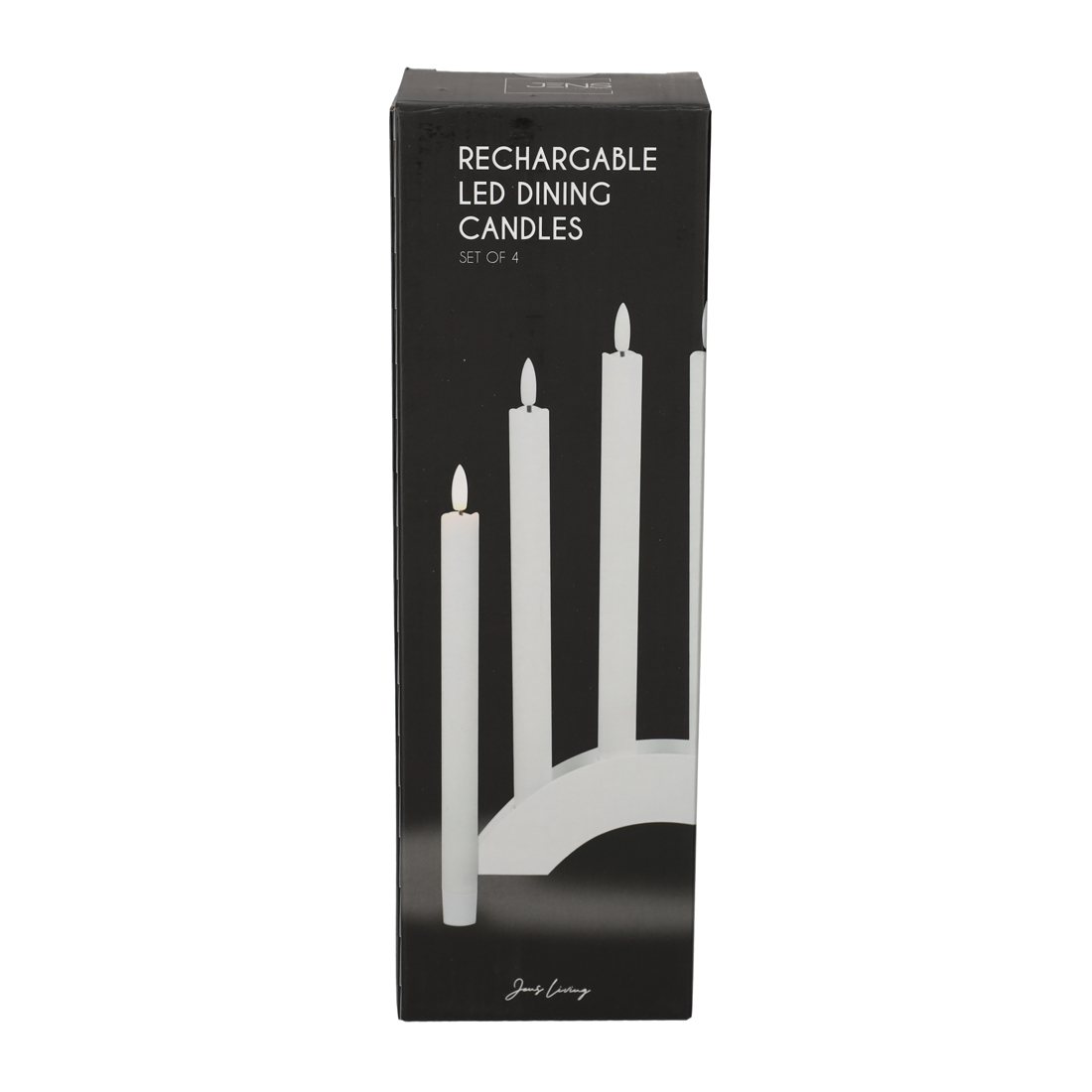 Deze set van vier LED dinerkaarsen is oplaadbaar en eenvoudig te bedienen met een afstandsbediening. Plaats de kaarsen in de oplaadbasis en verbind deze aan een stroompunt. Zodra de kaarsen zijn opgeladen kun je genieten van het sfeervolle licht dat ze afgeven. De kaarsen zijn een veilig en duurzaam alternatief voor traditionele kaarsen, omdat deze niet aangestoken hoeven te worden. Een groot voordeel hiervan is dat ze niet opbranden.