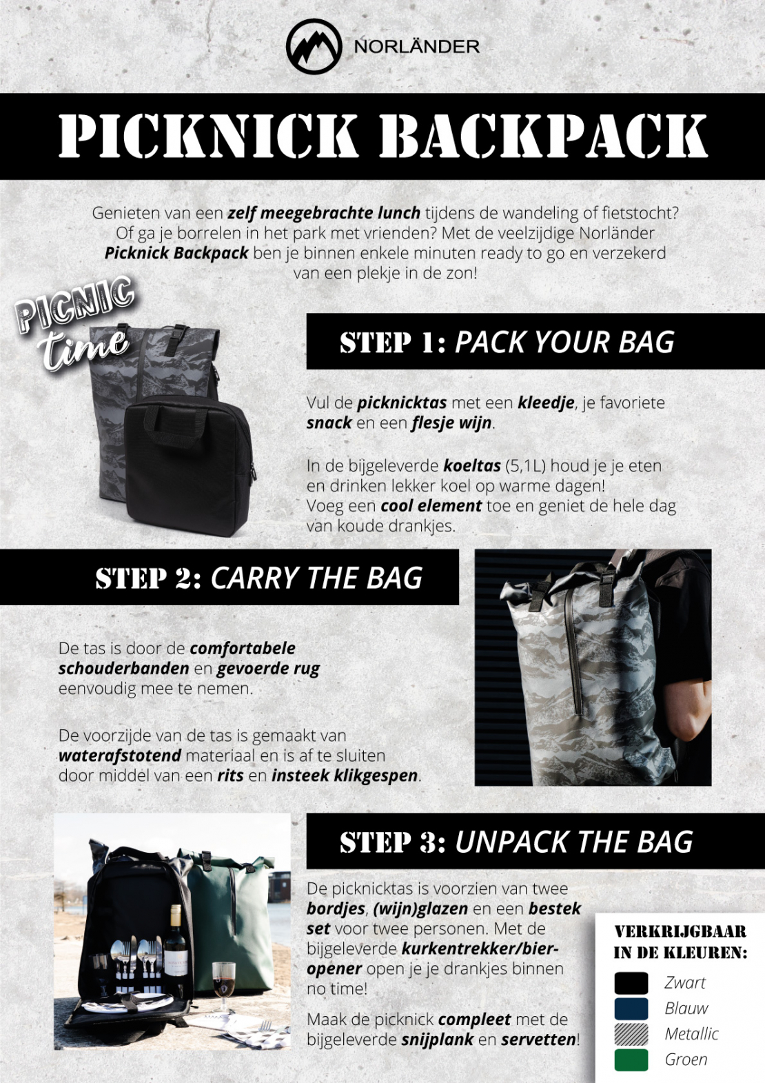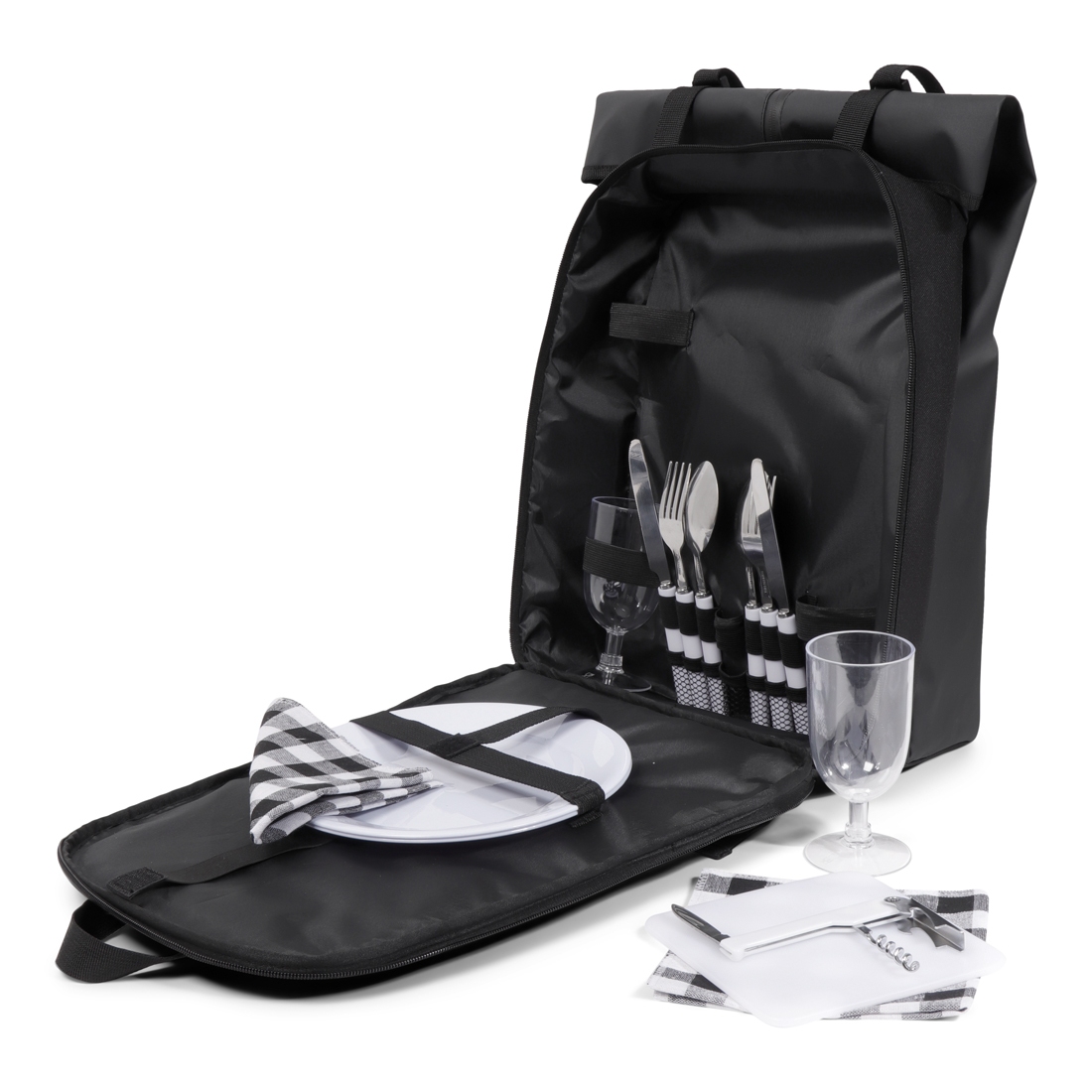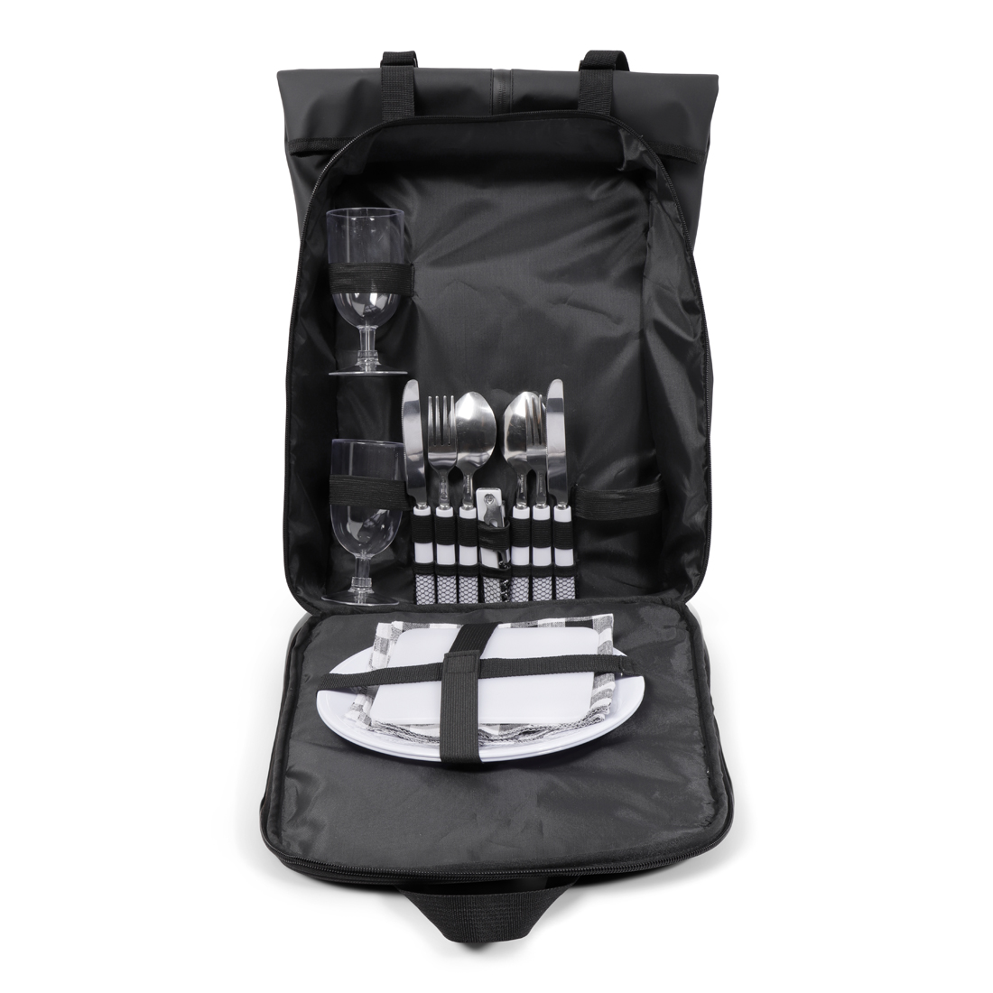 De tas bevat 2 plastic bekers, 2 borden, een bestek set voor 2 personen en een snijplank. Verder zitten er 2 servetten van stof in met een zwart en wit geruit patroon. Ook heeft de tas nog ruimte om bijvoorbeeld een heerlijke fles wijn mee te nemen. Uiteraard mag de toegevoegde kurkentrekker dan ook niet ontbreken. Al het bestek kan bevestigd worden door middel van de elastische banden.