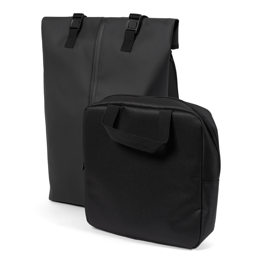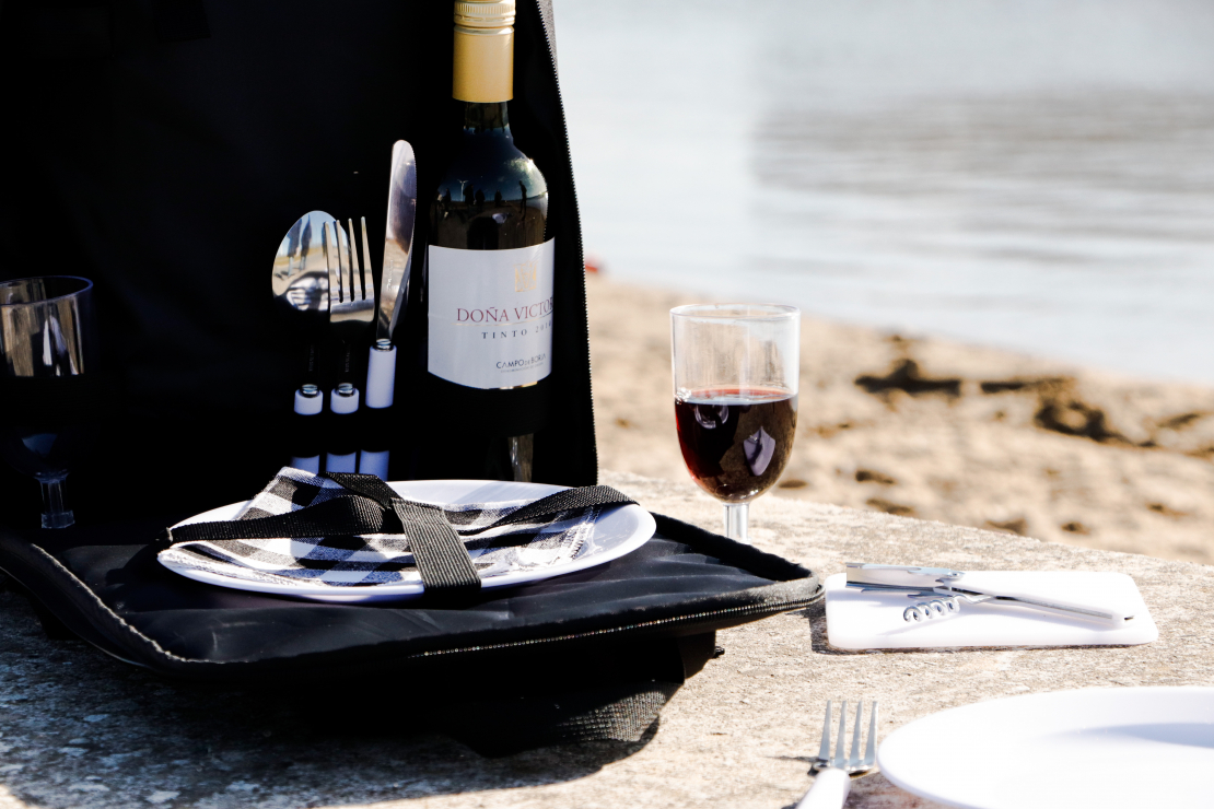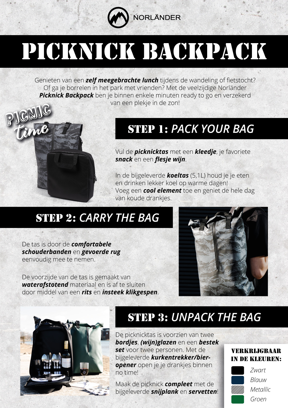 De tas bevat 2 plastic bekers, 2 borden, een bestek set voor 2 personen en een snijplank. Verder zitten er 2 servetten van stof in met een zwart en wit geruit patroon. Ook heeft de tas nog ruimte om bijvoorbeeld een heerlijke fles wijn mee te nemen. Uiteraard mag de toegevoegde kurkentrekker dan ook niet ontbreken. Al het bestek kan bevestigd worden door middel van de elastische banden.