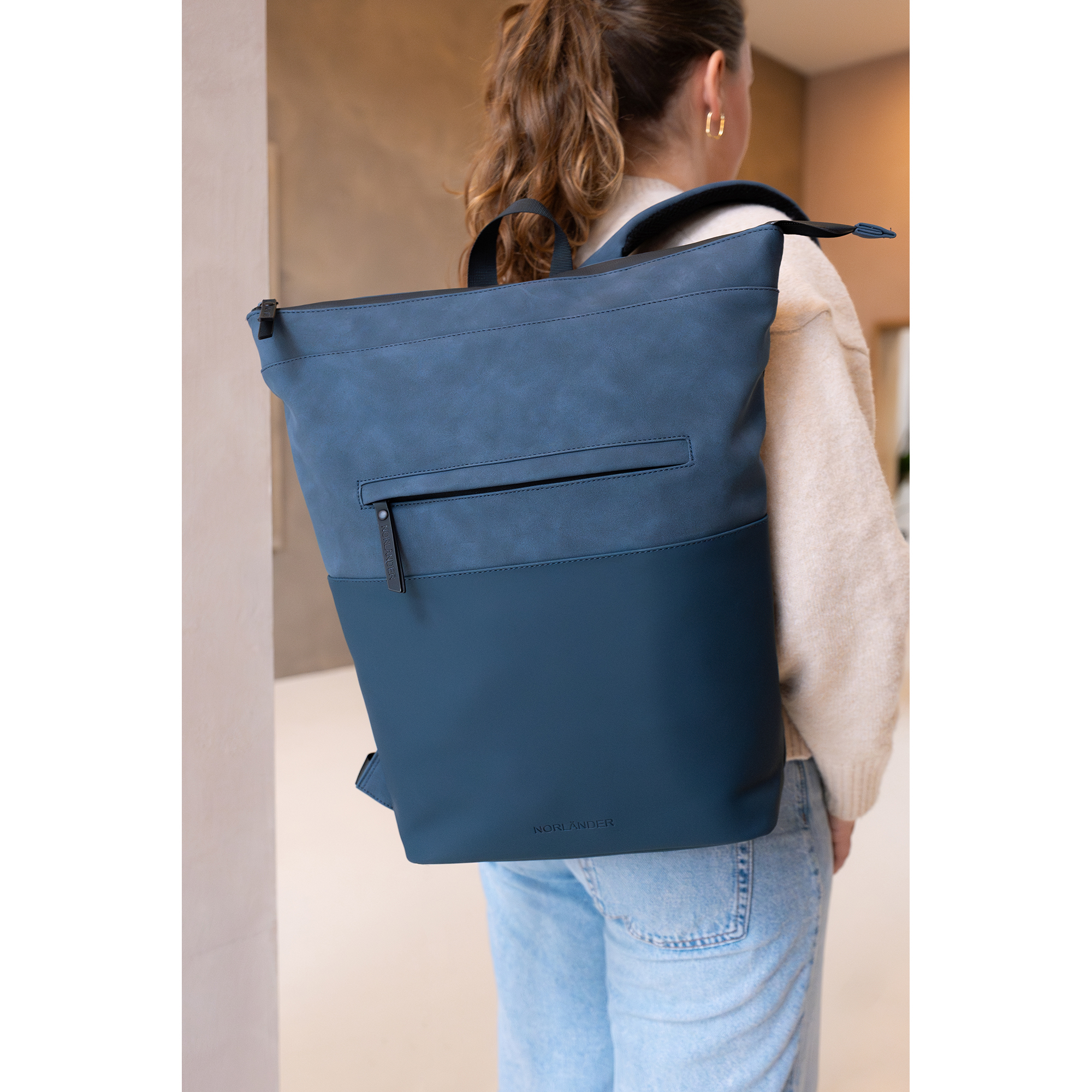 Deze rugtas is de perfecte combinatie van stoer en chique. De bovenkant van de tas is gemaakt van Nubuck vegan leer en de onderkant is gemaakt van Dull PU. Beide een waterafstotend materiaal. In combinatie met de waterdichte rits is deze tas dus ook geschikt voor slechtere weersomstandigheden. De binnenzijde van de tas bevat een groot hoofdcompartiment en een gevoerd laptopvak. Op de voorzijde van de tas bevindt zich een afsluitbaar ritsvak voor kleine accessoires.