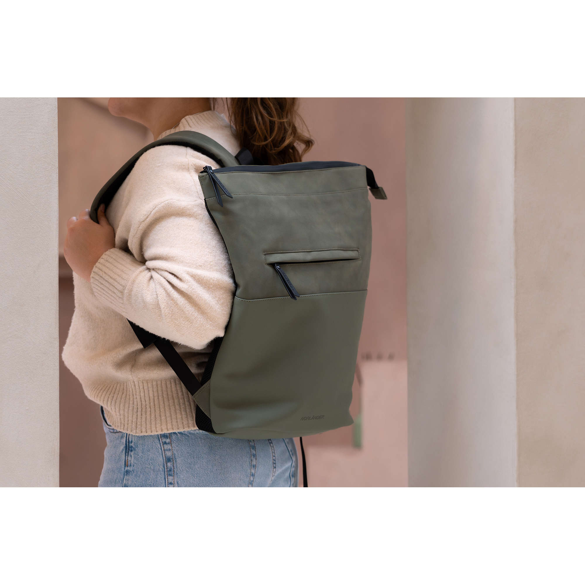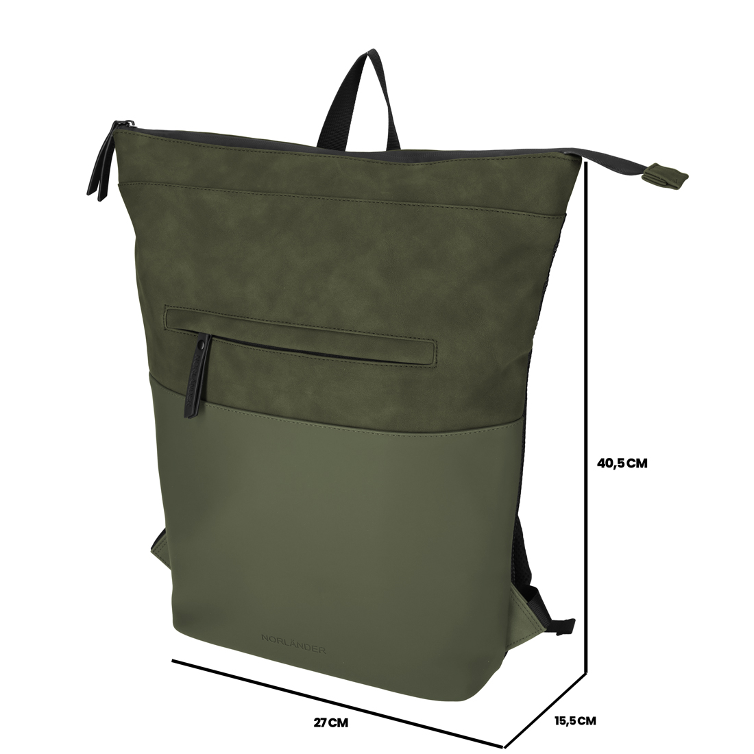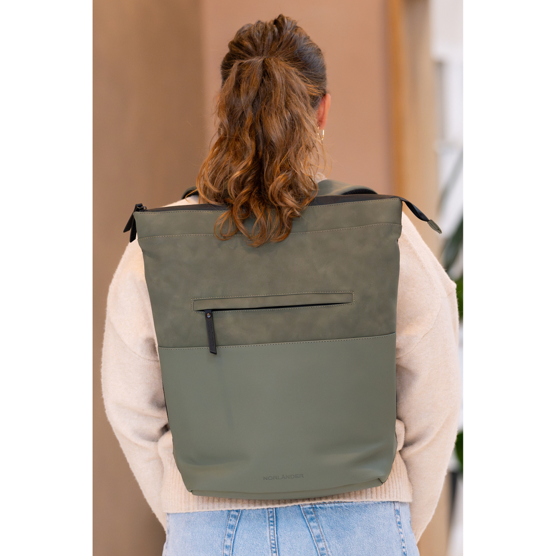 Deze rugtas is de perfecte combinatie van stoer en chique. De bovenkant van de tas is gemaakt van Nubuck vegan leer en de onderkant is gemaakt van Dull PU. Beide een waterafstotend materiaal. In combinatie met de waterdichte rits is deze tas dus ook geschikt voor slechtere weersomstandigheden. De binnenzijde van de tas bevat een groot hoofdcompartiment en een gevoerd laptopvak. Op de voorzijde van de tas bevindt zich een afsluitbaar ritsvak voor kleine accessoires.