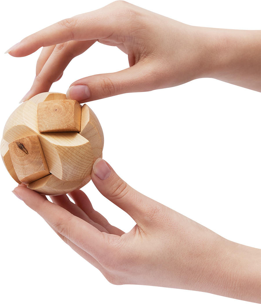 Puzzlebal ROUND DEXTERITY, bestaande uit 6 houten puzzle-delen, incl. houten standaard en gebruiksaanwijzing.
