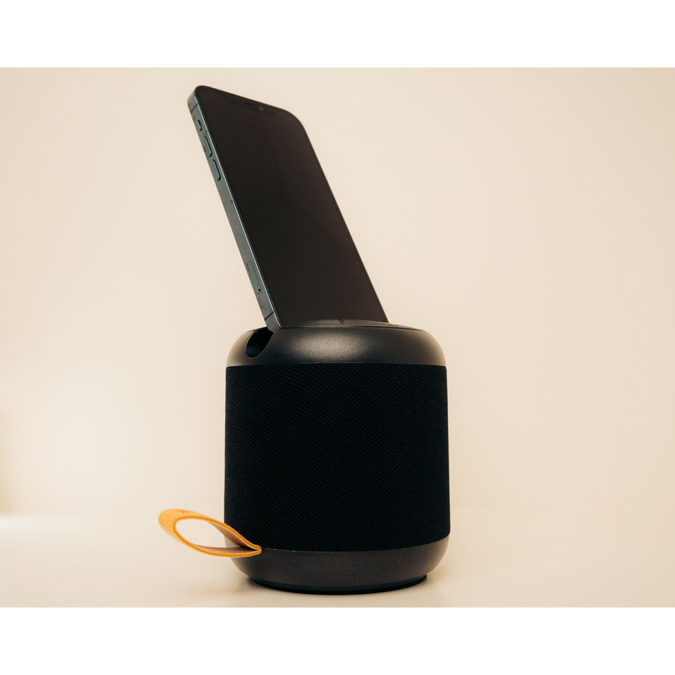 CHandzaam model welke ook voorzien is van een telefoonhouder. Doordat de speaker is gemaakt van tarwestro, is er sprake van een duurzaam en ecologisch verantwoorde speaker. De batterijcapaciteit geeft de mogelijkheid om de speaker voor een periode van minimaal 4 uur lang te gebruiken. Aan de onderzijde van de speaker zitten een aantal knoppen om je muziek mee te bedienen. Verder is deze voorzien van een geïntegreerde smartphone-standaard en een handsfree microfoon om te bellen.