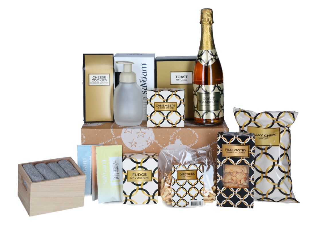 De luxe lekkernijen uit de Style de Luxe serie maken dit pakket compleet. Denk aan verfijnde zoete en hartige hapjes, stijlvol verpakt in goud-, zwart- en wittinten voor een exclusieve uitstraling. Perfect voor een moment van pure verwennerij – of dat nu tijdens de feestdagen is of op een rustig moment voor jezelf.