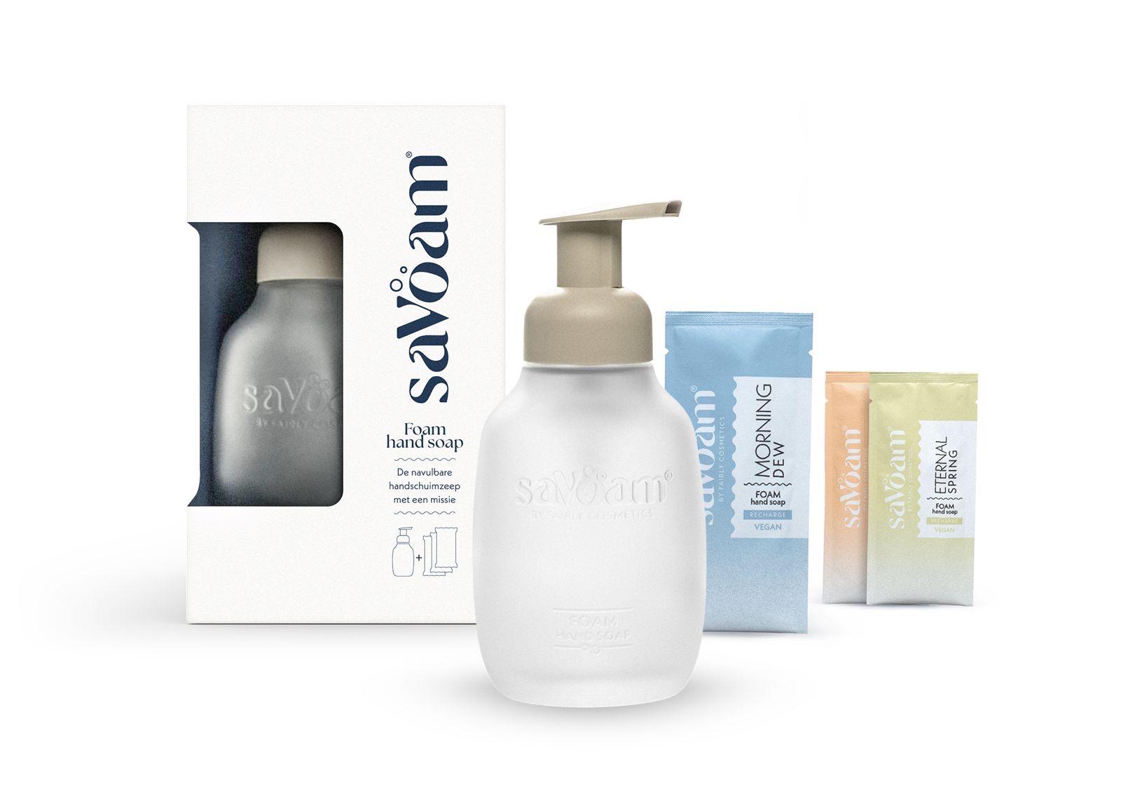 • SaVoam starterspakket met glazen navulfles, gebruiksinstructies en 3 refill-sachets