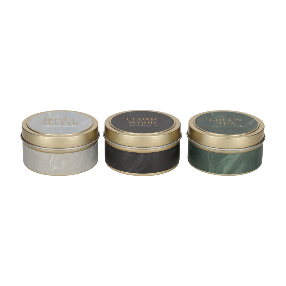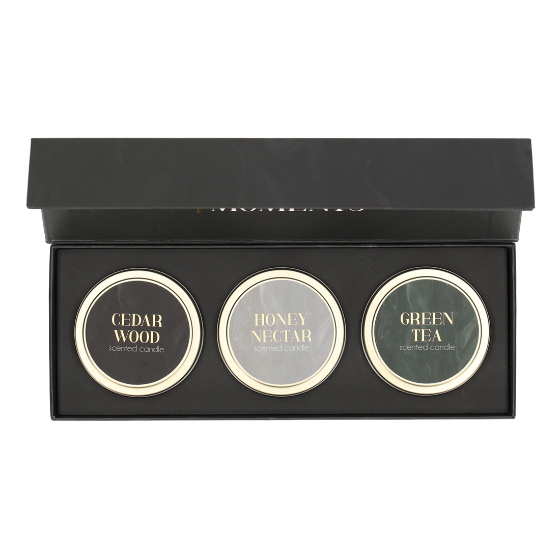 Breng sfeer in huis met deze set van drie geurkaarsen. De kaarsen, verpakt in charmante blikjes, vullen je huis met de warme geuren van Ceder Wood, Green Tea en Honey Nectar. Elke kaars heeft een brandtijd van ongeveer 10 uur, waardoor je langdurig kunt genieten van de gezellige geur. Perfect voor het creëren van een warme ambiance.