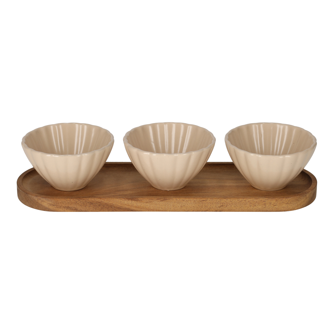Deze leuke serveerset is ideaal voor het serveren van snacks, dips of zoete lekkernijen. De set bestaat uit een acaciahouten plankje met drie keramieken schaaltjes in de vorm van een schelp, wat het een unieke en speelse uitstraling geeft. Een stijlvolle manier om je hapjes te presenteren!