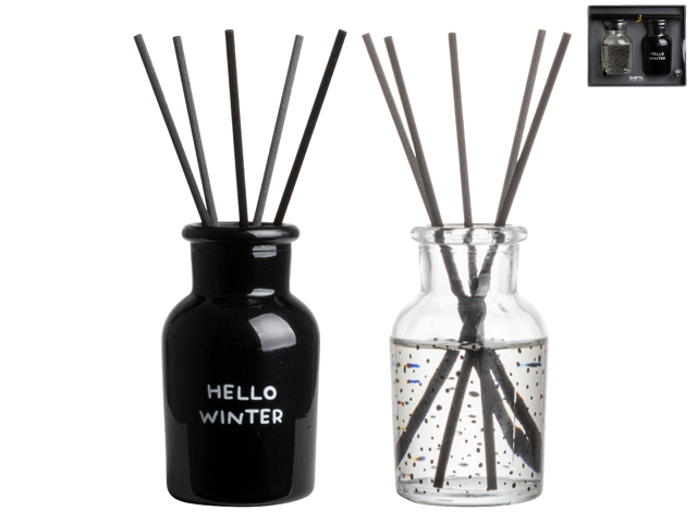 Hmm, dat ruikt lekker! Deze trendy set bestaat uit 2 diffusers met geurstokjes en ze hebben beide een heerlijke winterse geur. Naast dat ze een fijne geur verspreiden zien ze er ook nog eens heel leuk uit, de zwarte diffuser heeft de tekst "Hello Winter" en de transparante diffuser is voorzien van een leuk stippel/streepjes patroon. Enjoy!