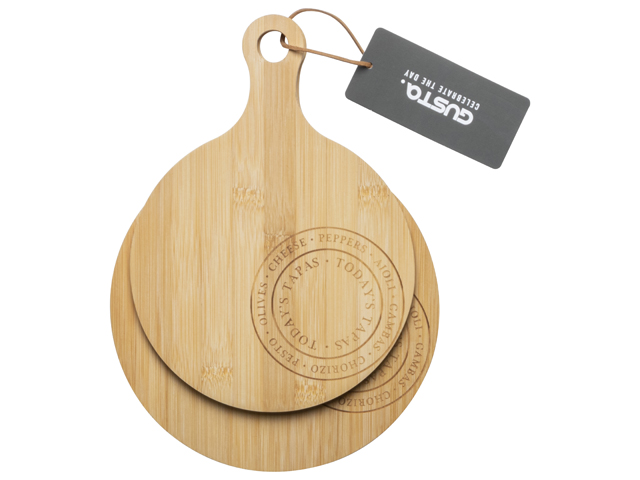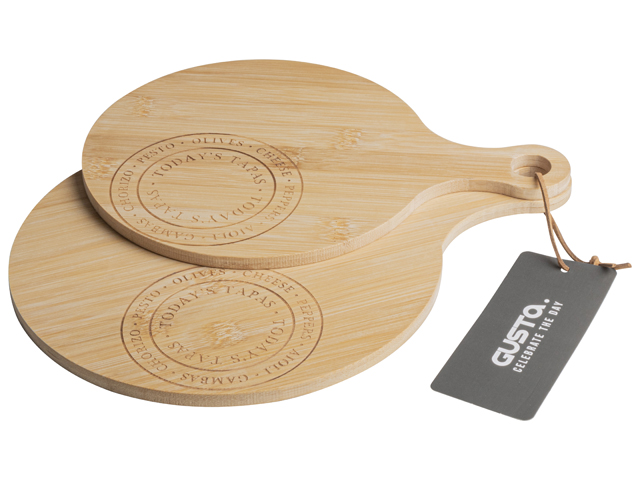 Met deze set van 2 kleine ronde serveerplanken maak je een gezellig tapasbuffet met kleine gerechtjes of je gebruikt ze als borrelplanken voor de lekkerste hapjes. Een fijne set die niet in je keuken mag ontbreken. De planken zijn licht in gewicht en hebben een leuke stempel opdruk met tekst.