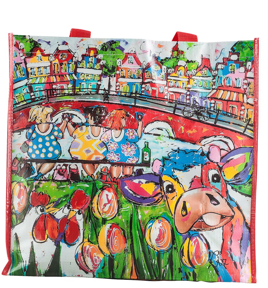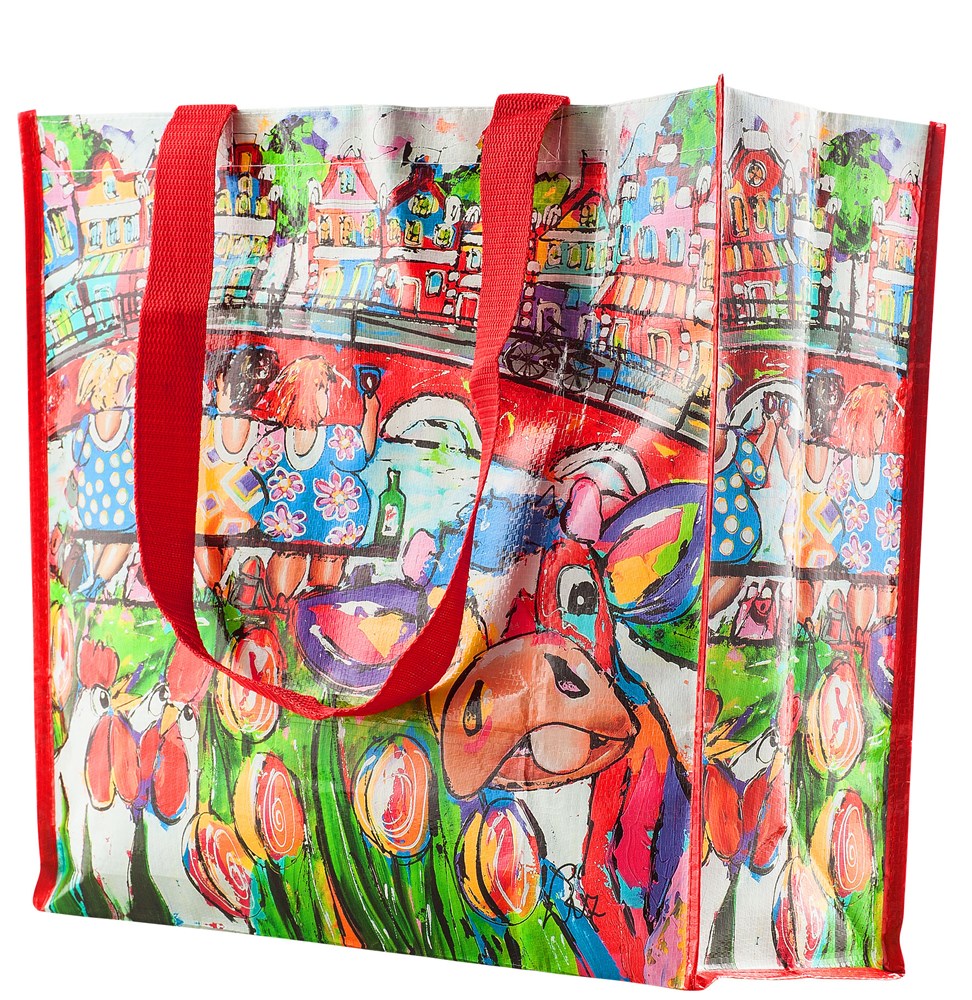 Deze tas met vrolijke taferelen is 40 cm bij 38 cm groot. Dat wordt lekker shoppen! En je raakt er niet gauw op uitgekeken, iedere keer zie je weer iets nieuws op deze leuke shopper.