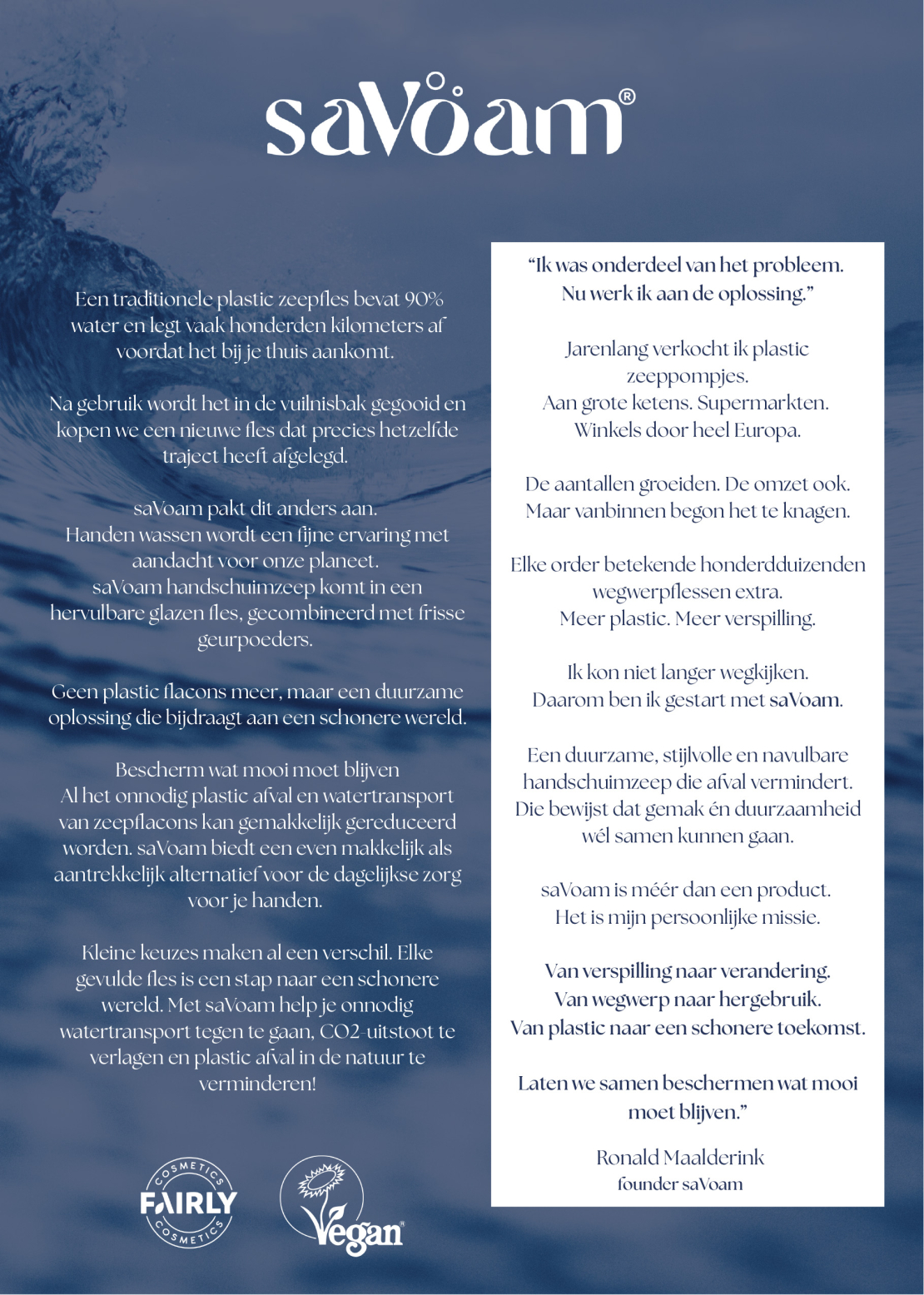 Met saVoam handschuimzeep zorg je goed voor jezelf, en de natuur. En dat is geen overbodige luxe. Handzeep in plastic flessen zorgt namelijk voor onnodig afval en watertransport. Dat kan makkelijk anders. saVoam is een heerlijke, navulbare handschuimzeep geïnspireerd door de Nederlandse kust. De sterke, glazen fles is gemaakt om levenslang mee te gaan. De zeep maak je simpelweg thuis door de speciaal ontwikkelde geuren aan te vullen met kraanwater.saVoam... Wat mooi is, moet mooi blijven.