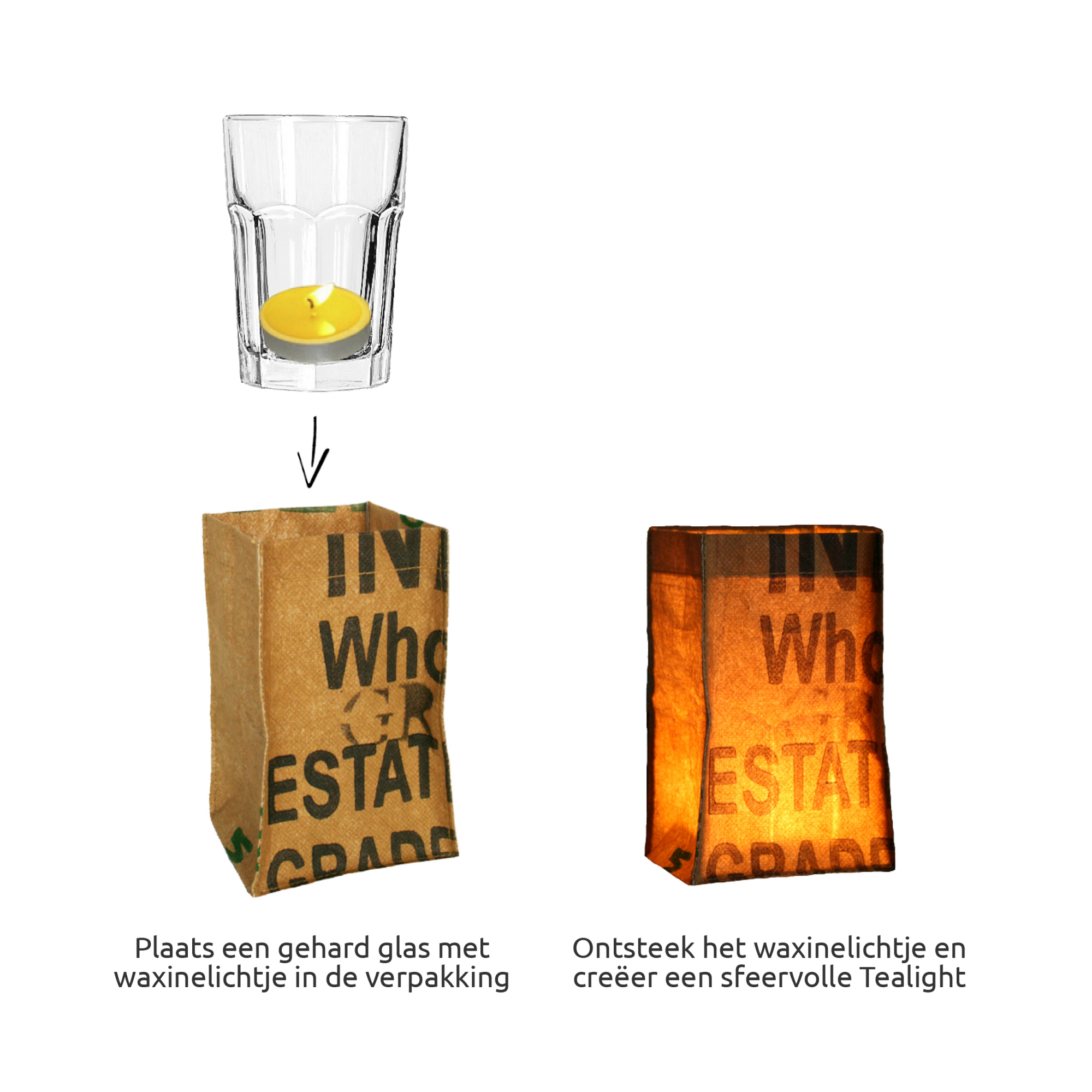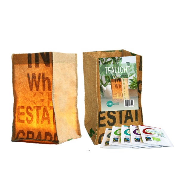 De tealight is gemaakt van gerecyclede theezakken uit de theepluk in India.