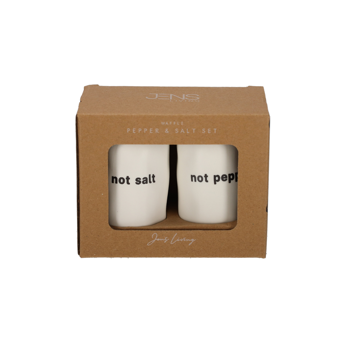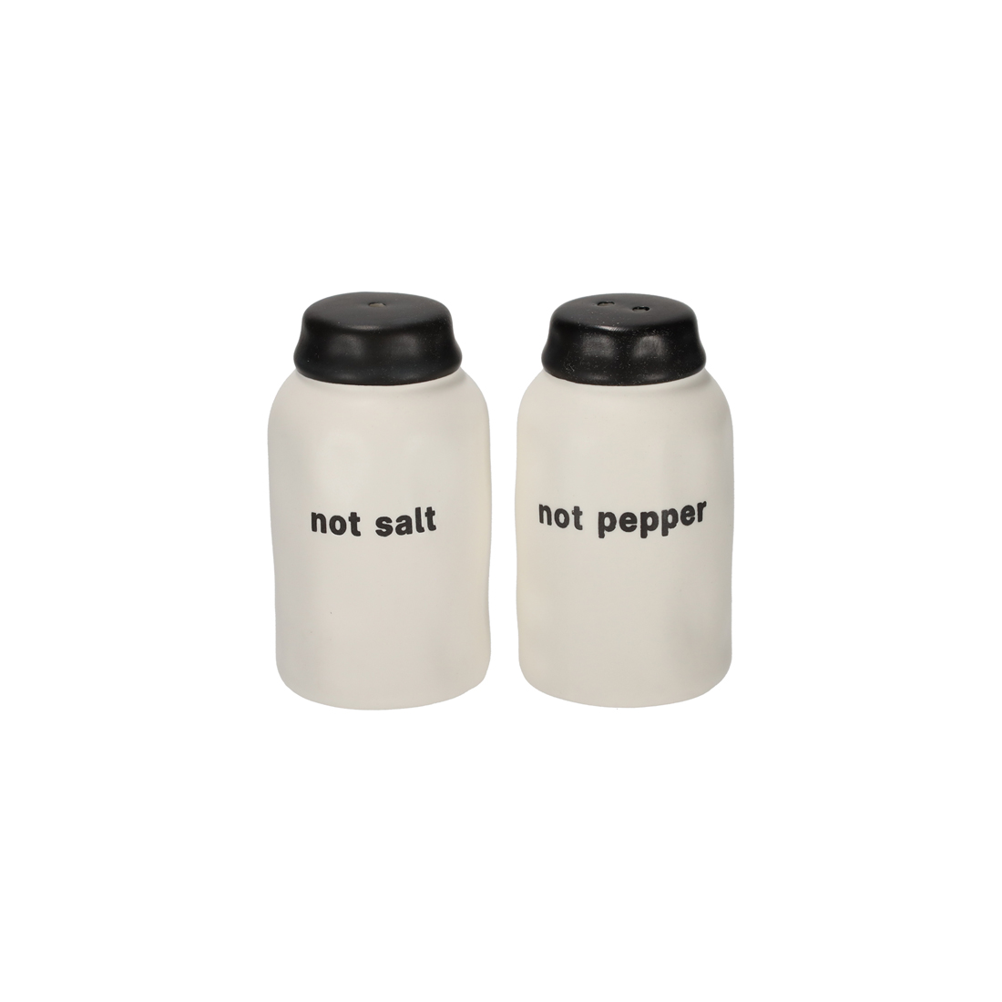 Geef je maaltijd extra pit met deze peper & zout set! De keramieken strooiers zijn voorzien van de teksten "not pepper" en "not salt".