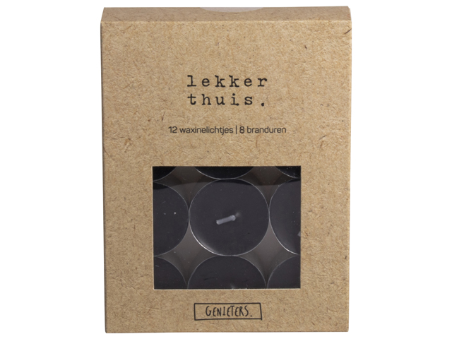 Breng sfeer in huis met deze set theelichtjes. De set bestaat uit twaalf zwarte waxinelichtjes.