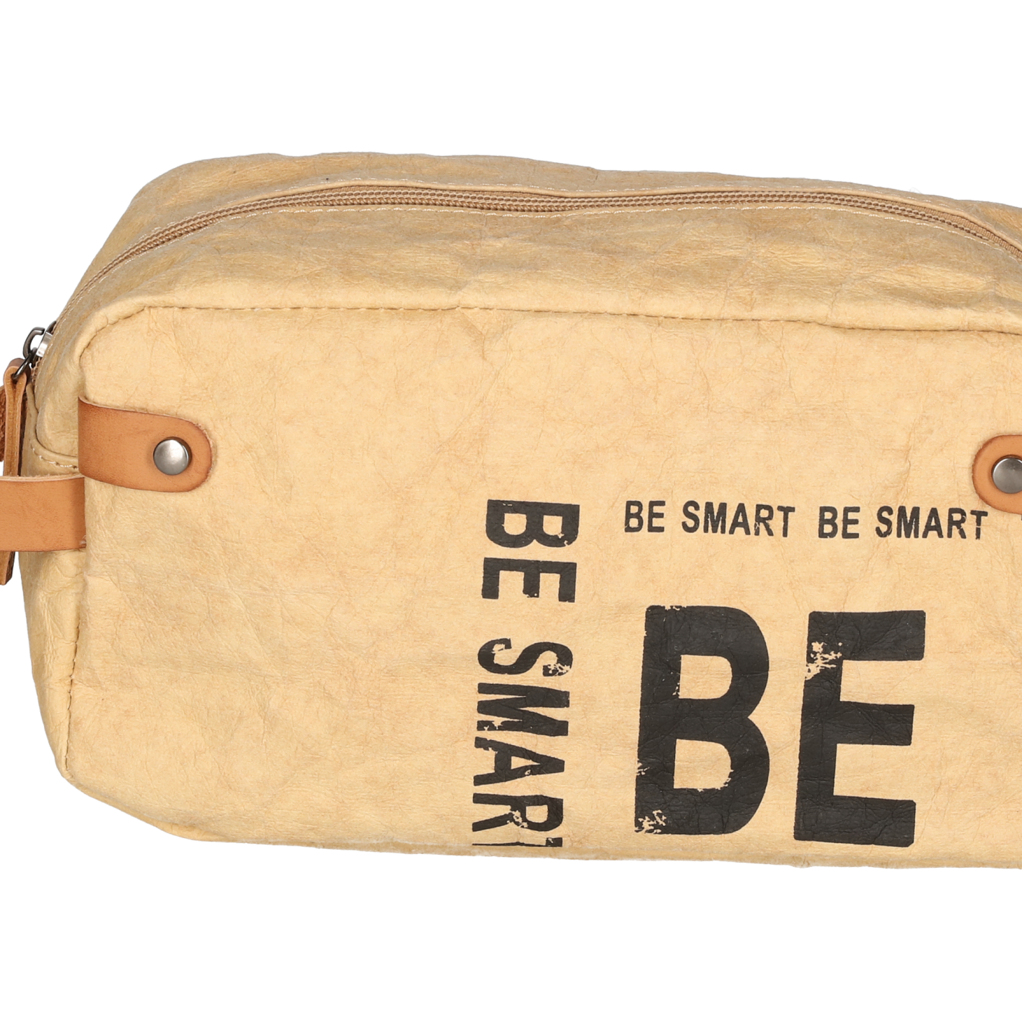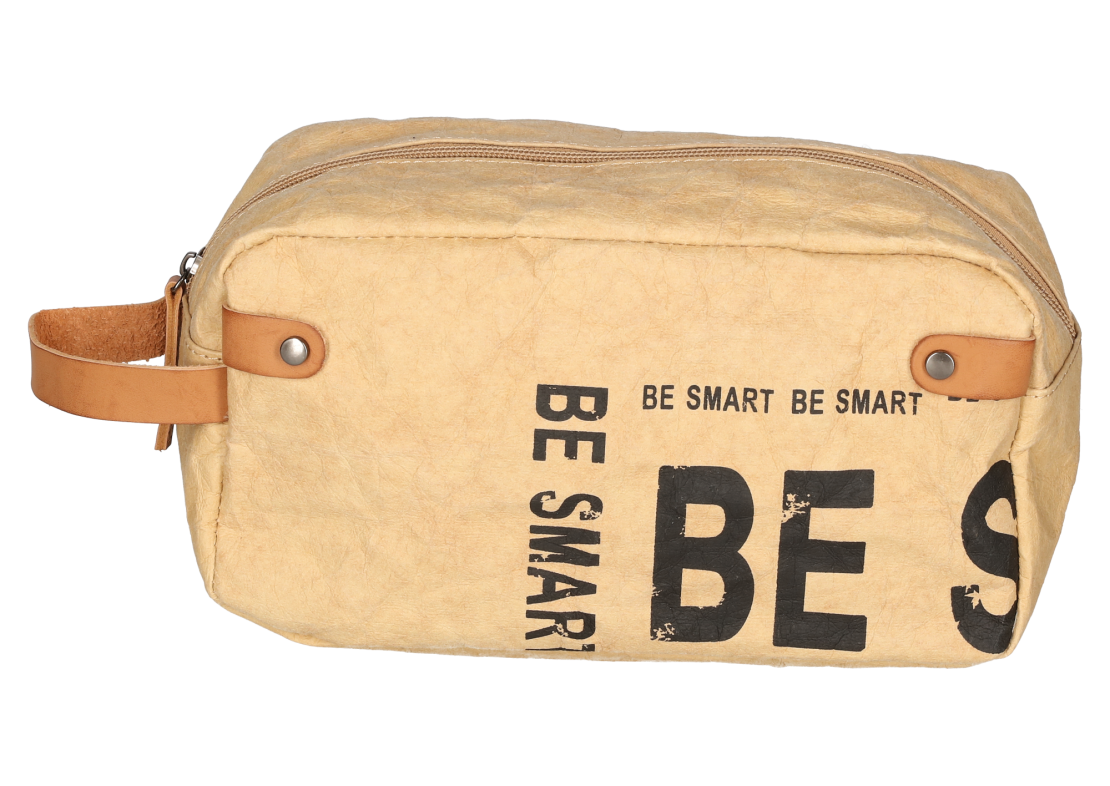 Unieke en karakteristieke mooi afgewerkte toilettas met lederen details gemaakt van gewassen papier. Aan de binnenzijde afgewerkt met een voering van polyester.