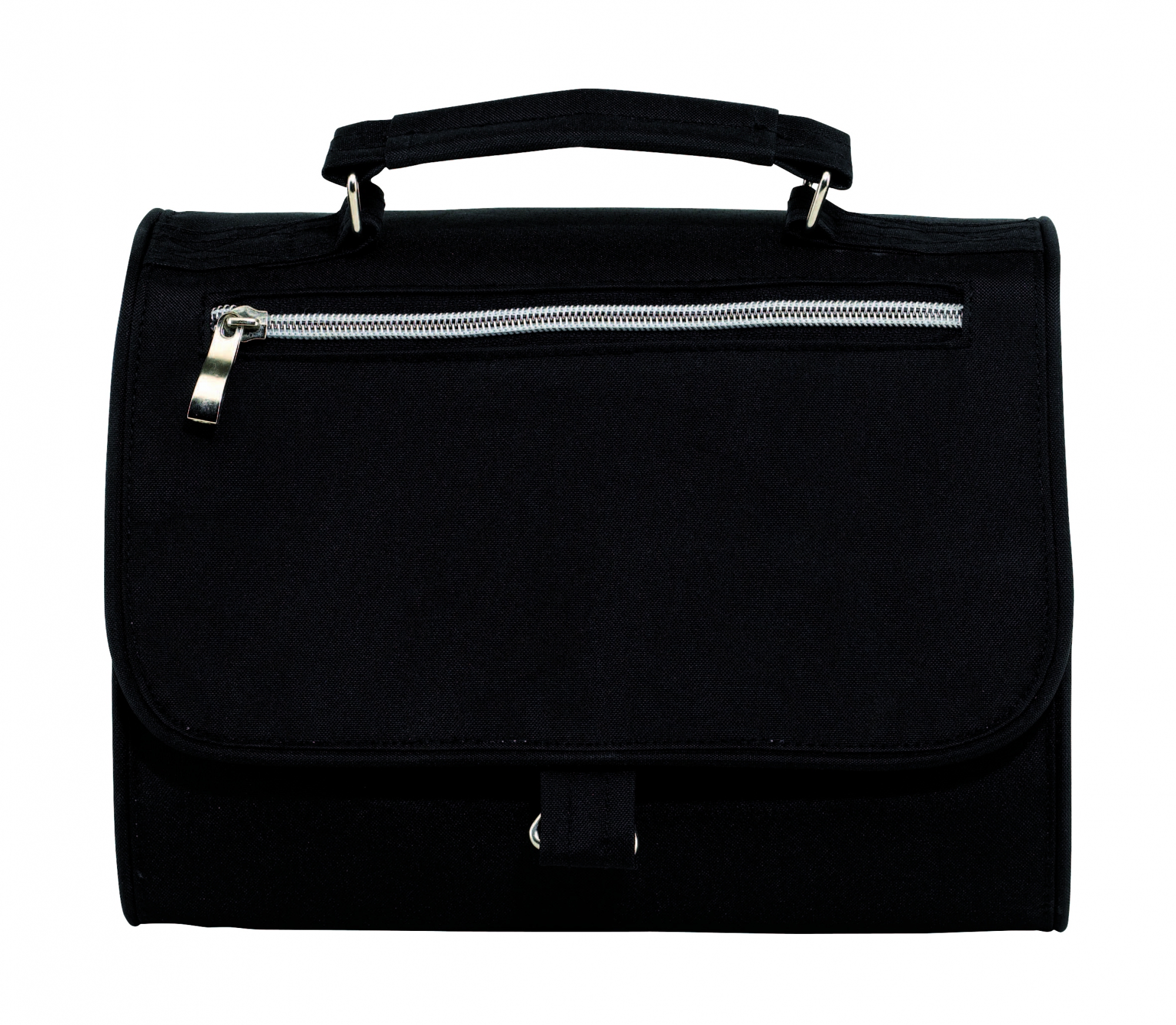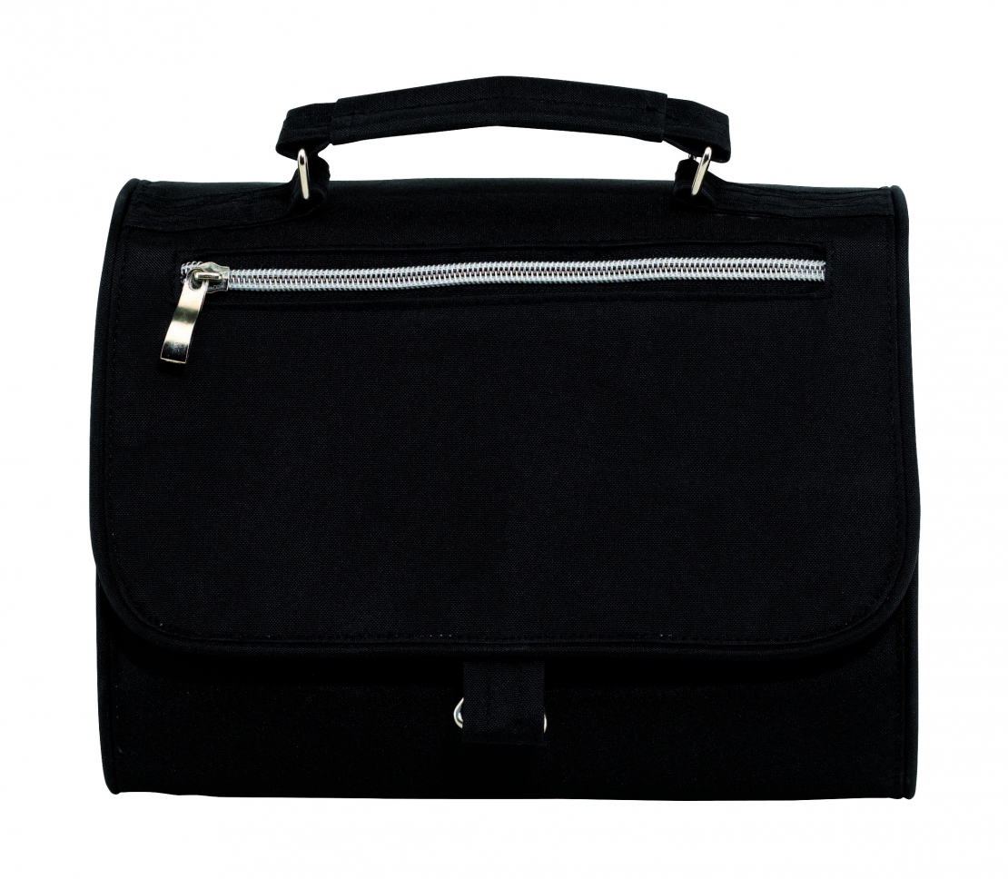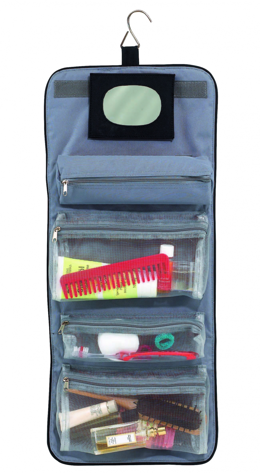 Toilettas STAR van 300D polyester met 5 middels rits afsluitbare compartimenten, afneembare spiegel, metalen haak en stevig handvat.